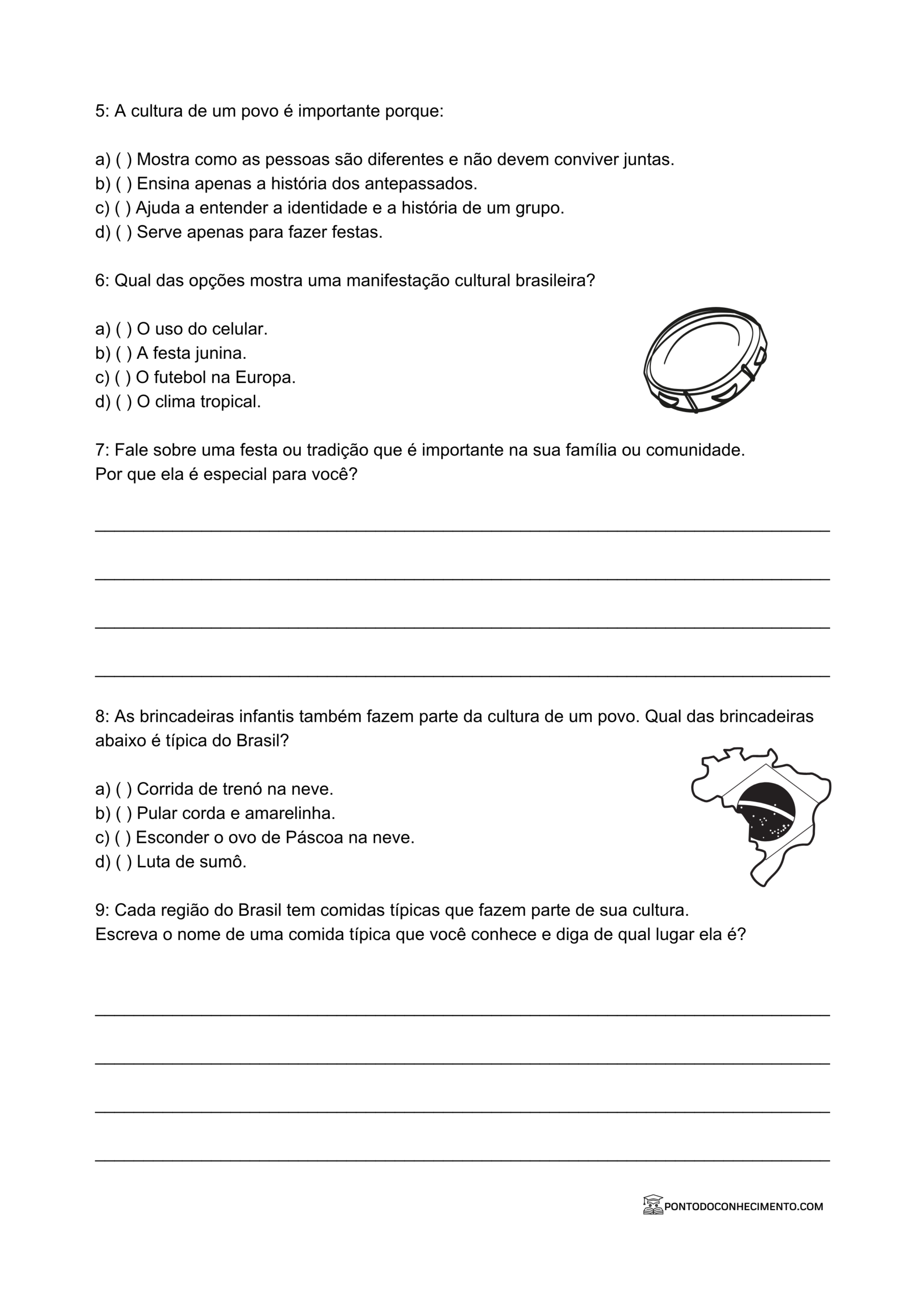 A cultura de um povo é formada por um conjunto de elementos que são compartilhados por um grupo social. Nesse sentido, as características culturais da nossa população são percebidas na música, na culinária, nas vestimentas e até mesmo na forma como nos comunicamos. Portanto, é fundamental que o estudante compreenda que a cultura não é algo pronto, mas sim uma construção constante realizada pelas pessoas ao longo do tempo.