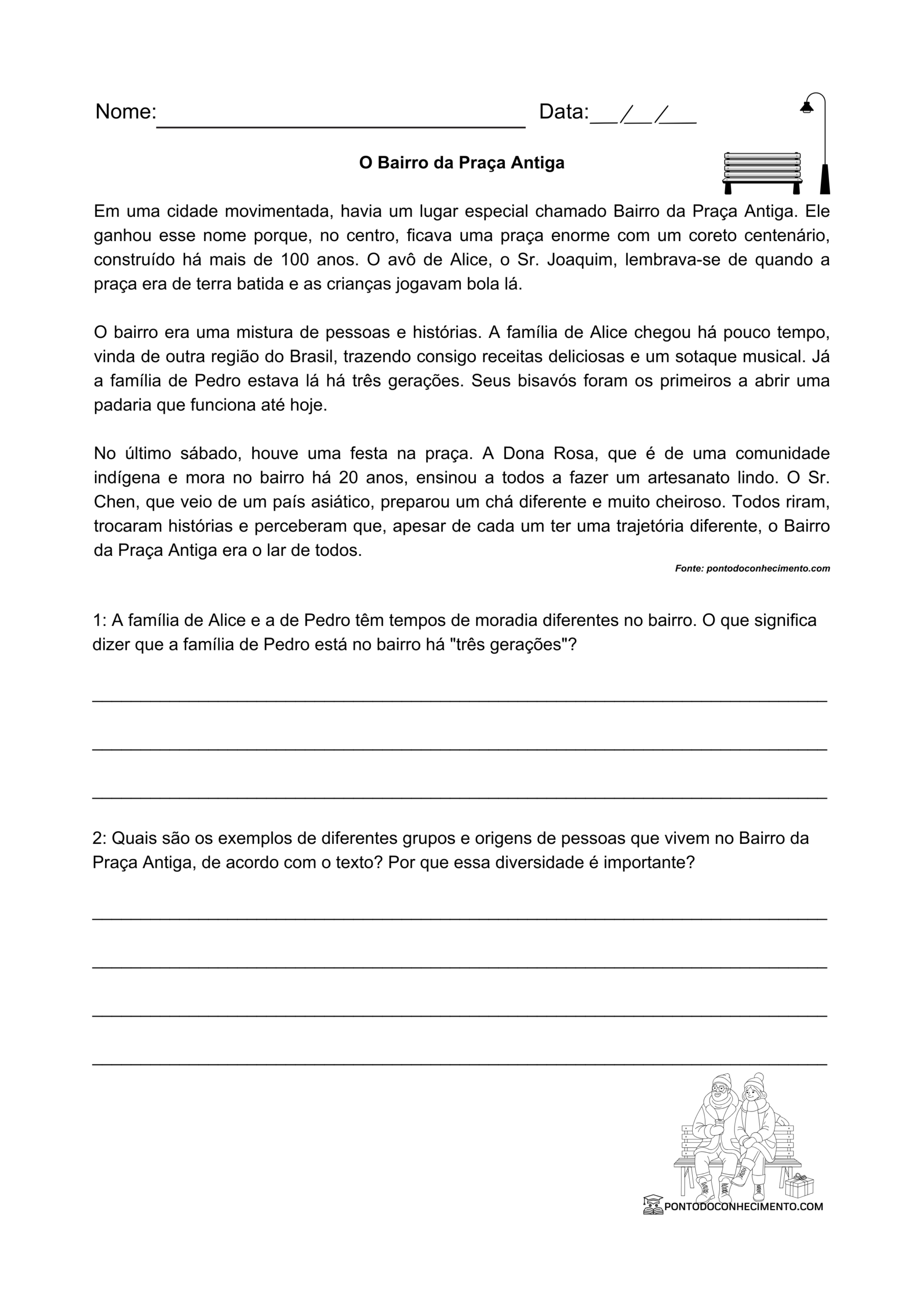 Todavia, a essência do bairro como ponto de encontro é mantida por meio das feiras, festas e manifestações culturais. Nesse contexto, a voz passiva é utilizada para descrever como o espaço foi ressignificado pela população. Desta forma, a criança aprende que, embora os objetos mudem, a função social da praça como lugar de memória coletiva permanece sendo essencial para a identidade do município.