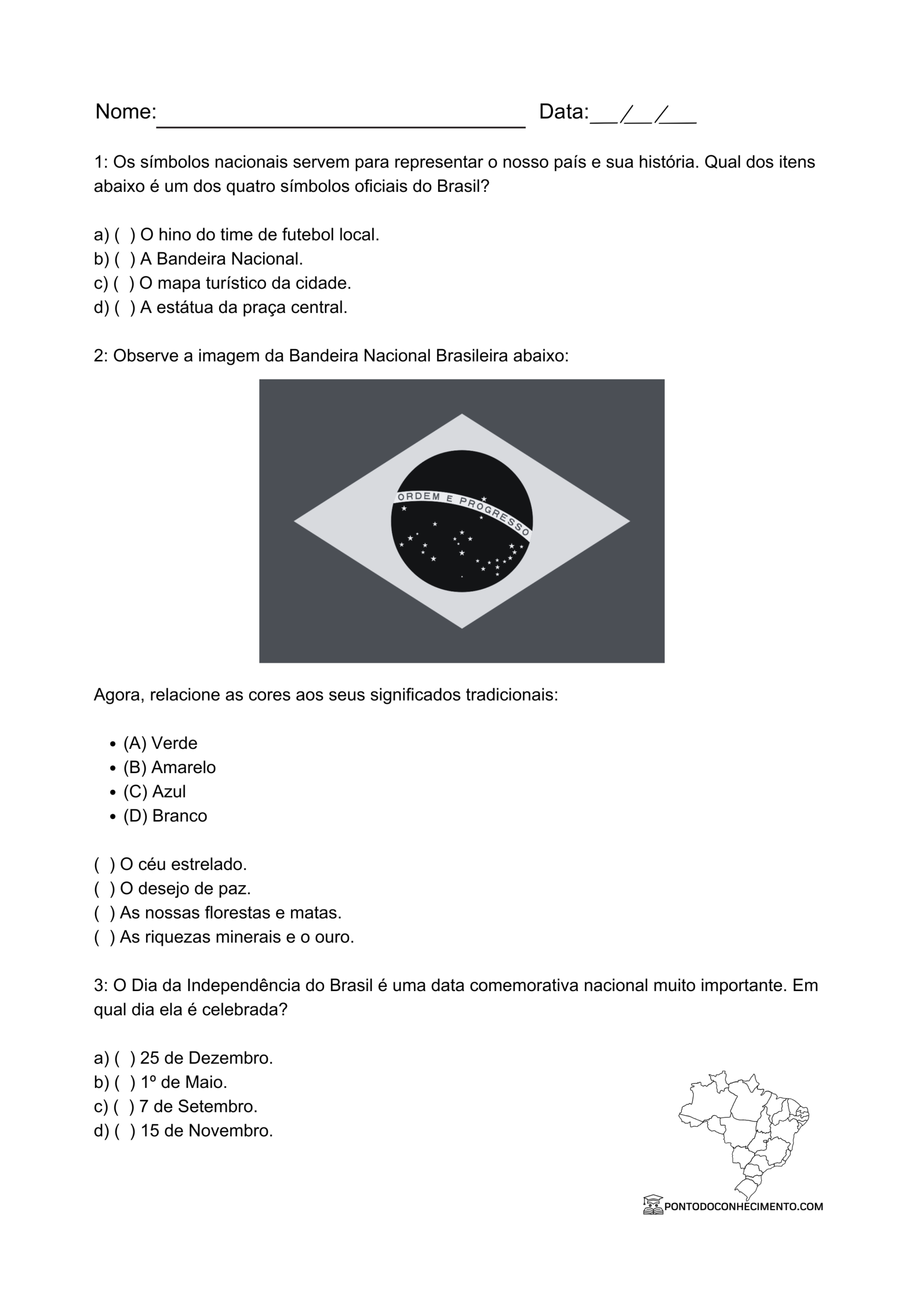 Atividade de História 3º Ano sobre Símbolos e Datas Comemorativas