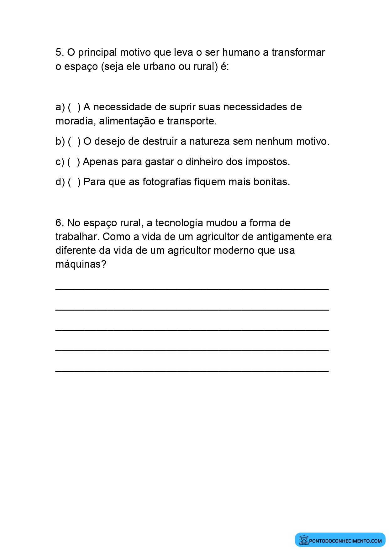 1. O principal motivo que leva o ser humano a transformar o espaço (seja ele urbano ou rural) é: