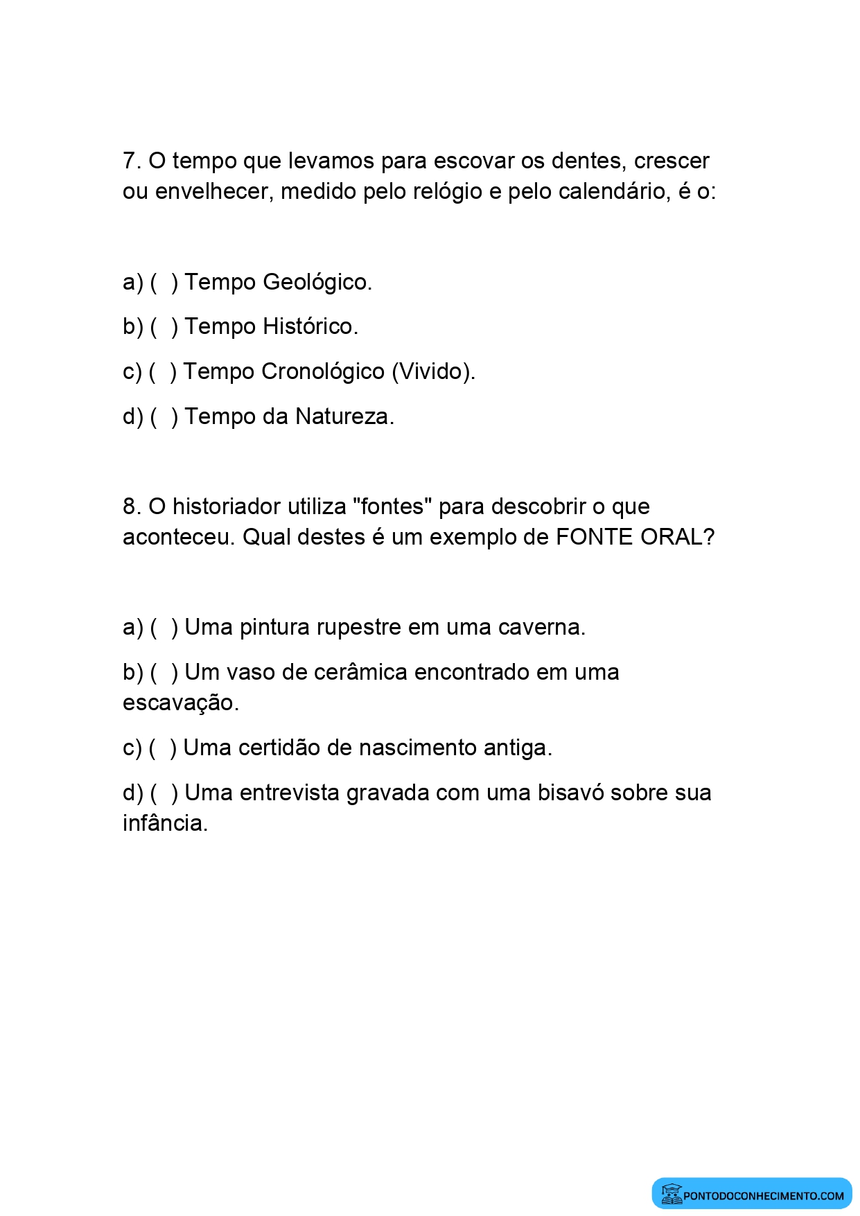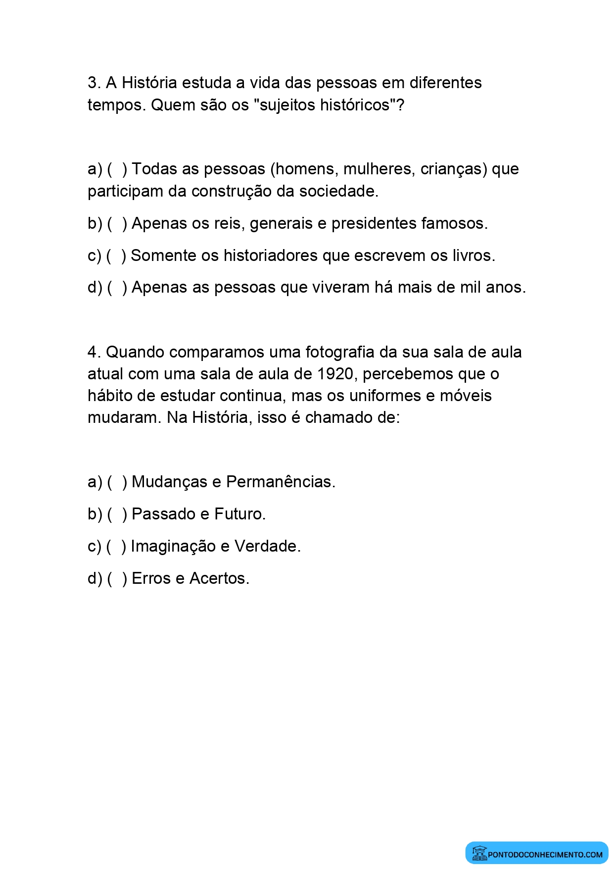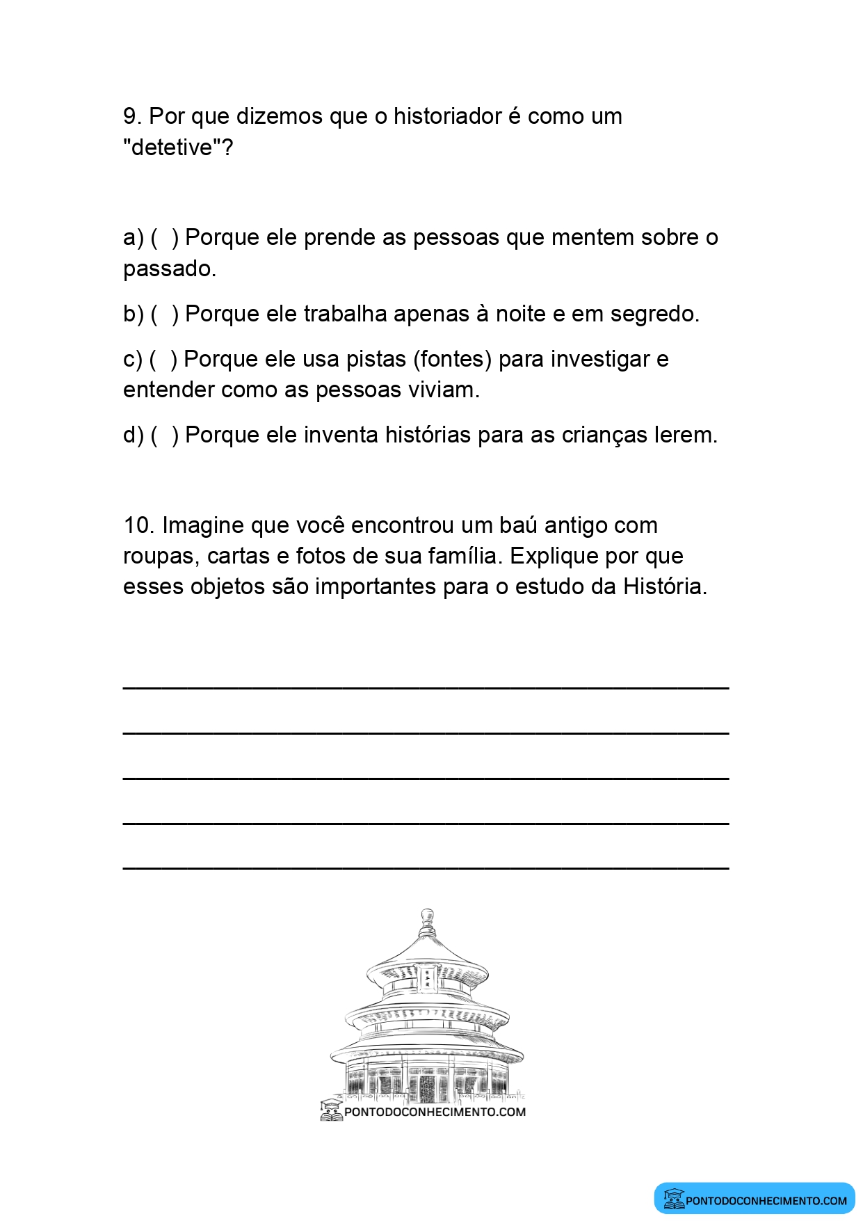 3. c) ( ) Porque ele usa pistas (fontes) para investigar e entender como as pessoas viviam.