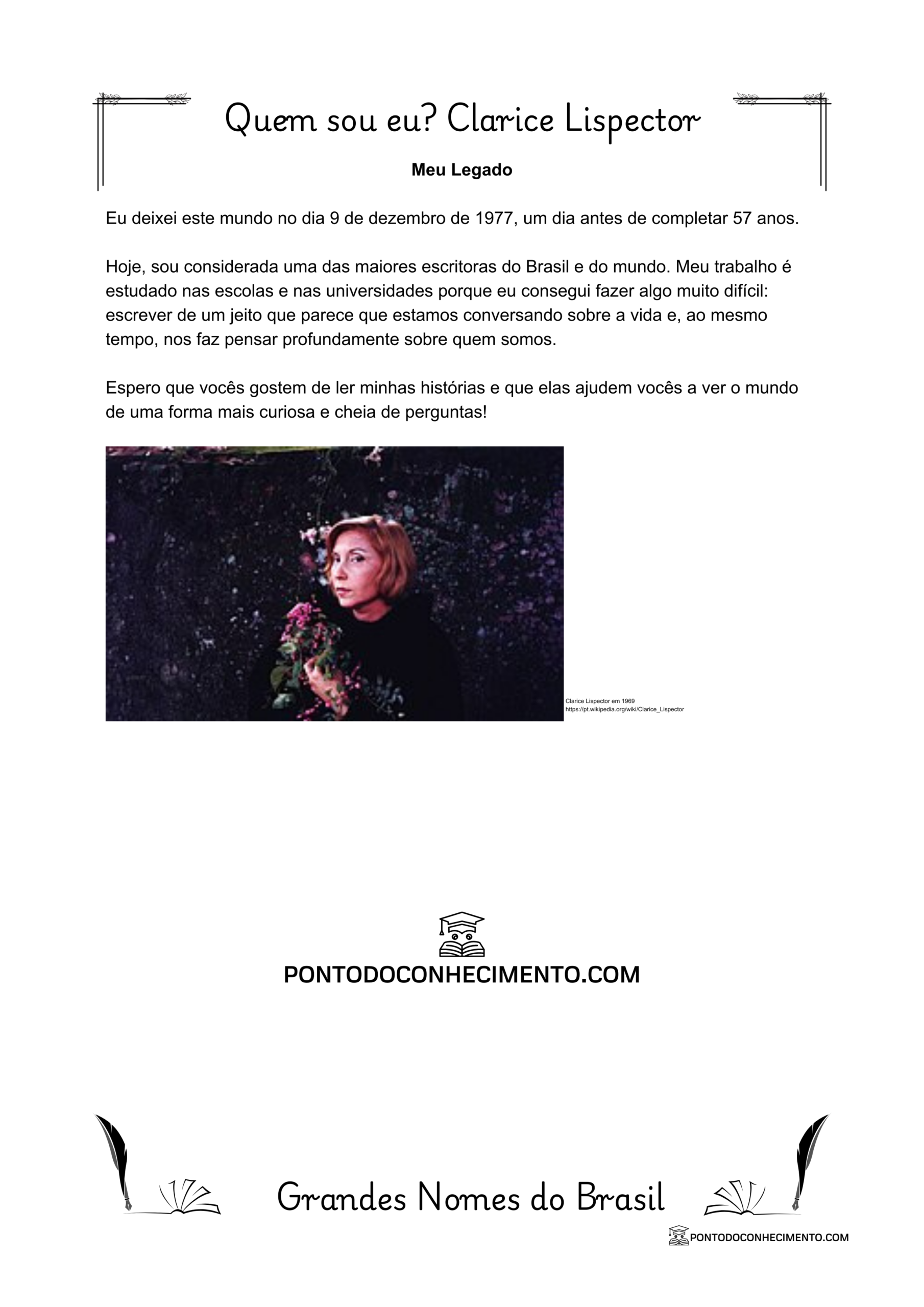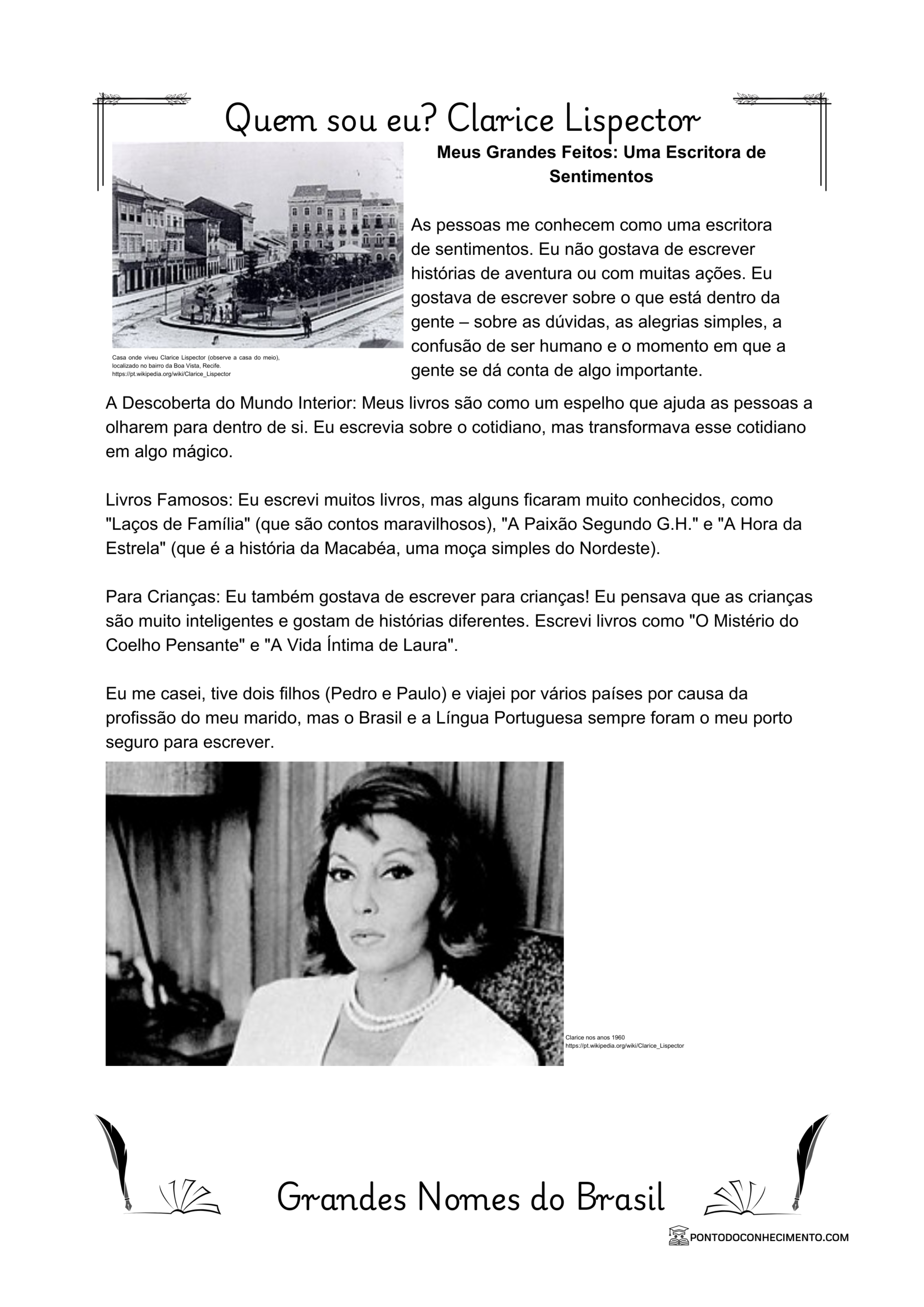 Livros Famosos: Eu escrevi muitos livros, mas alguns ficaram muito conhecidos, como “Laços de Família” (que são contos maravilhosos), “A Paixão Segundo G.H.” e “A Hora da Estrela” (que é a história da Macabéa, uma moça simples do Nordeste).