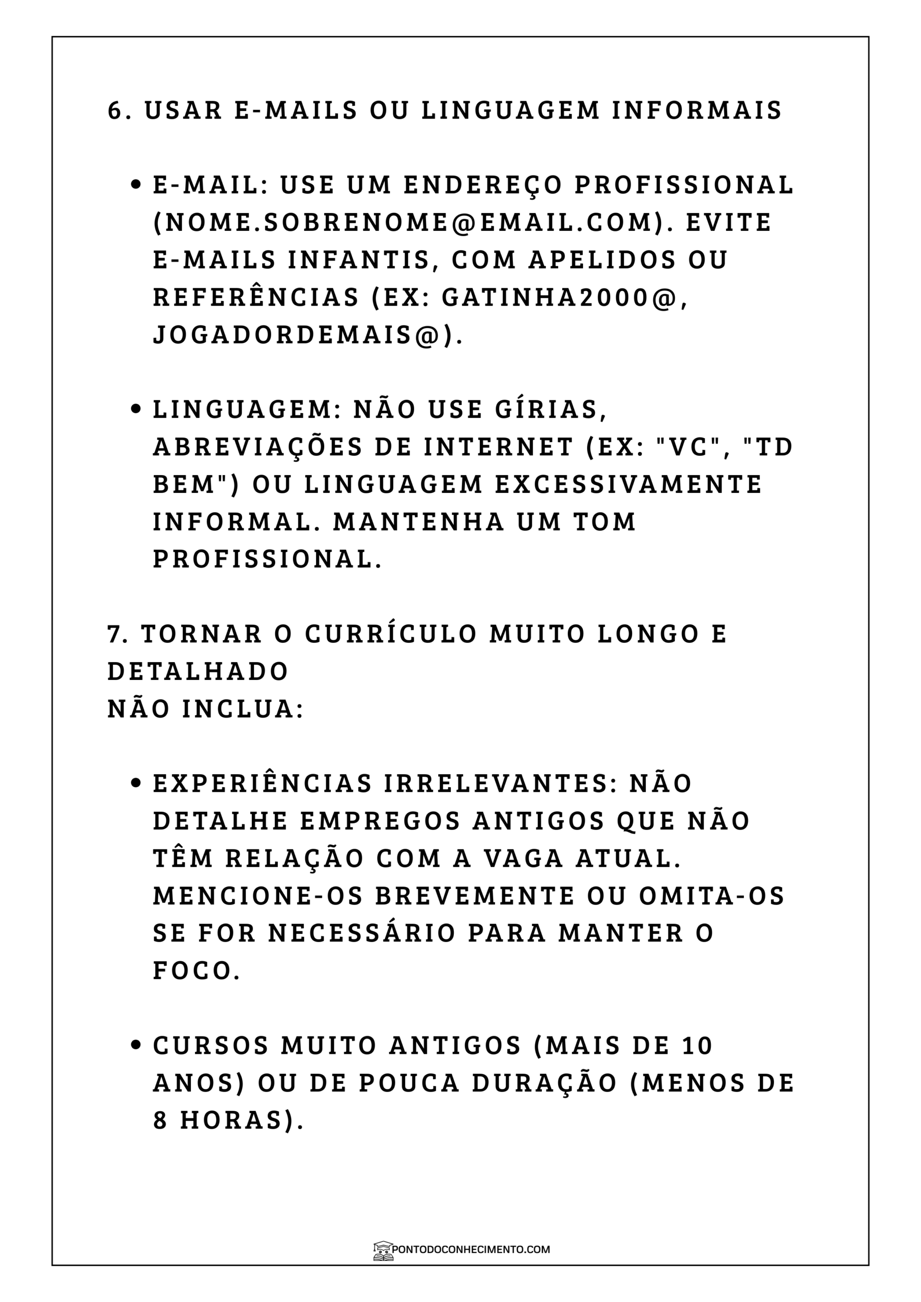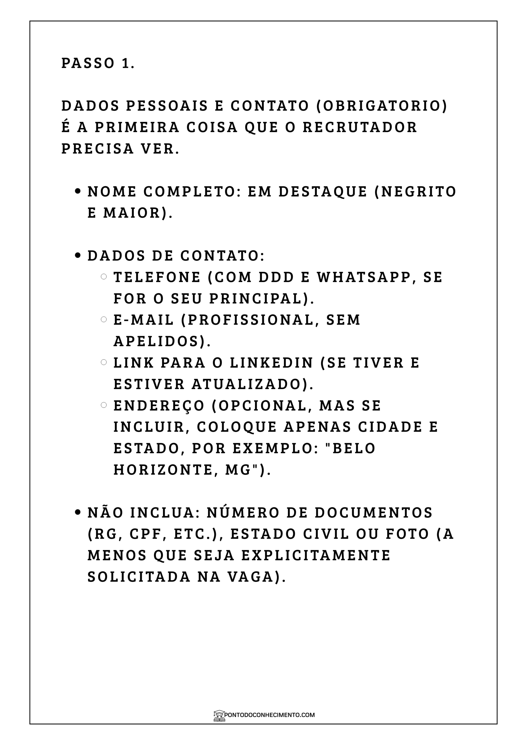 - Não Inclua: Número de documentos (RG, CPF, etc.), estado civil ou foto (a menos que seja explicitamente solicitada na vaga).
