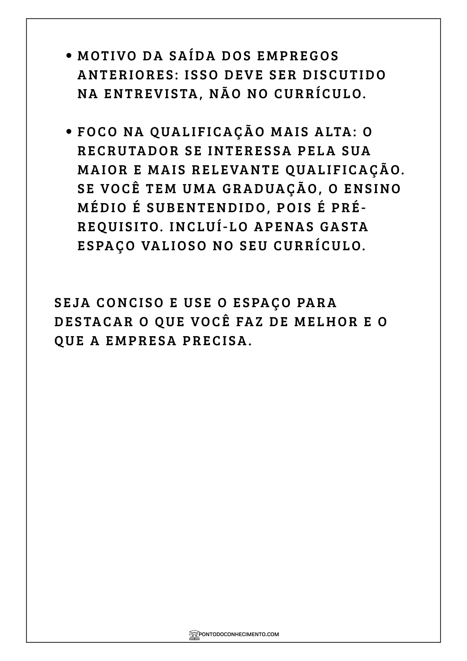 - Motivo da saída dos empregos anteriores: Isso deve ser discutido na entrevista, não no currículo.