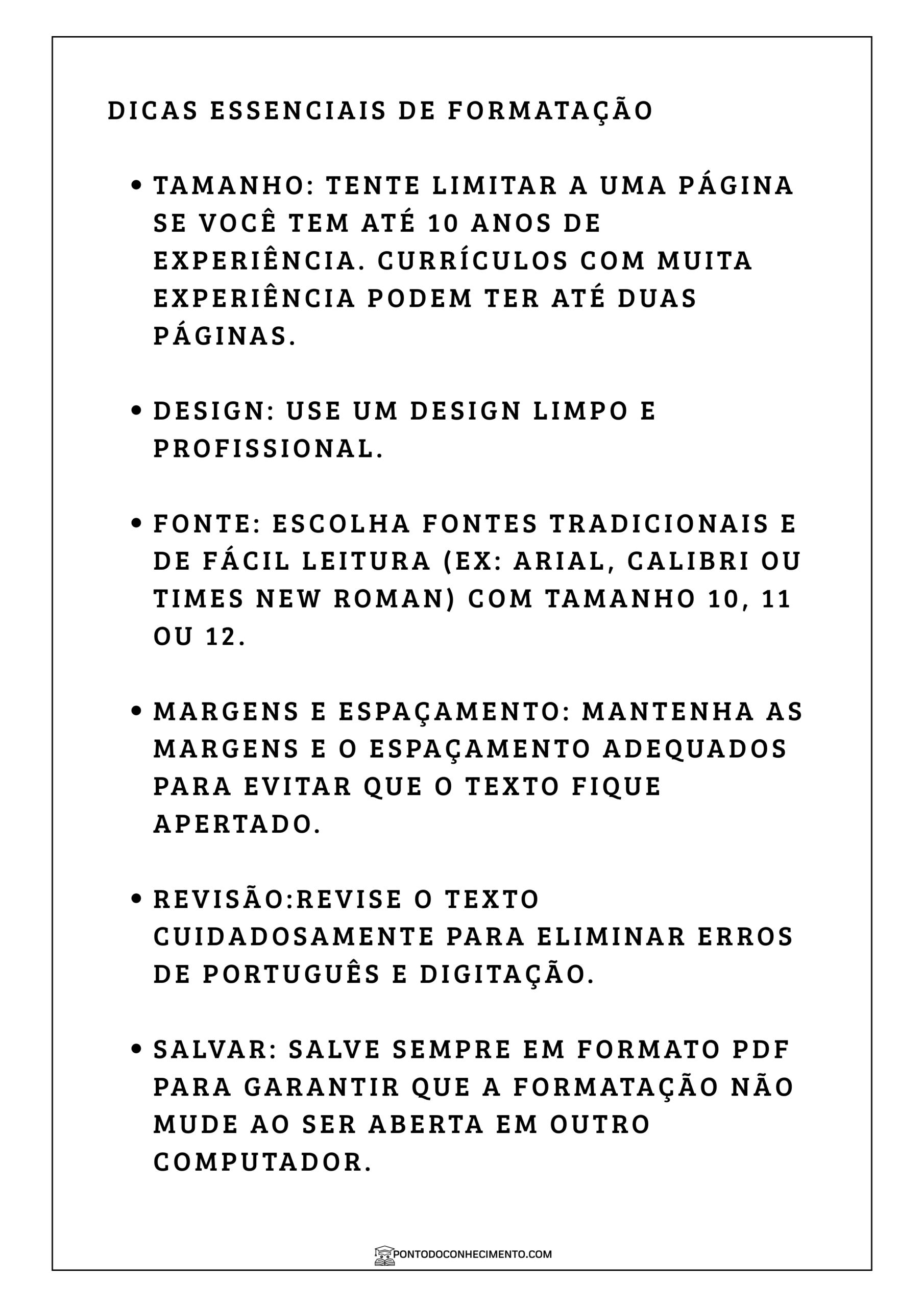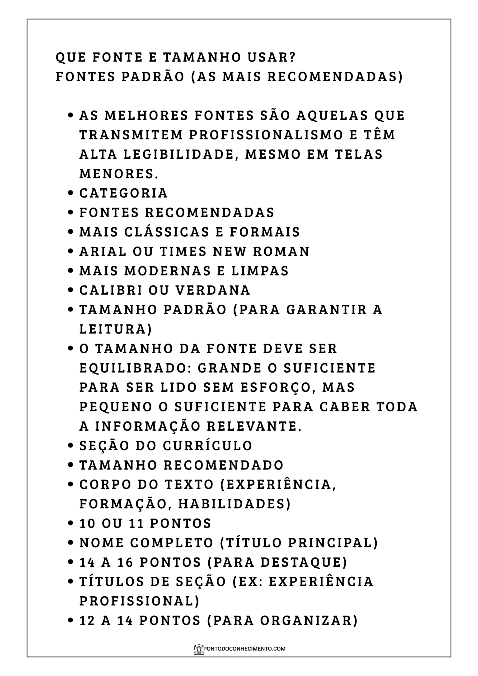- Fonte: Escolha fontes tradicionais e de fácil leitura (Ex: Arial, Calibri ou Times New Roman) com tamanho 10, 11 ou 12.