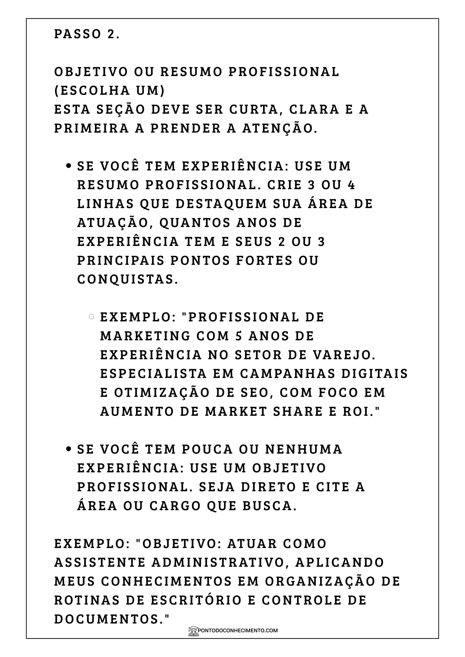 - Se você tem pouca ou nenhuma experiência: Use um Objetivo Profissional. Seja direto e cite a área ou cargo que busca.