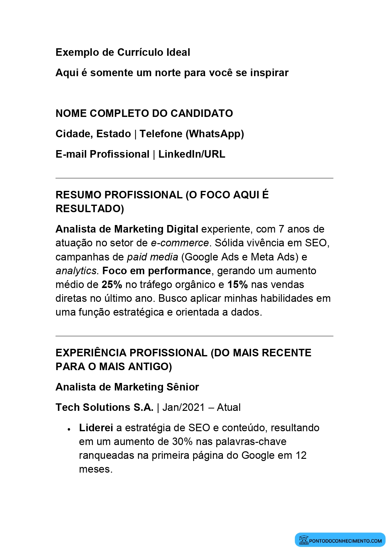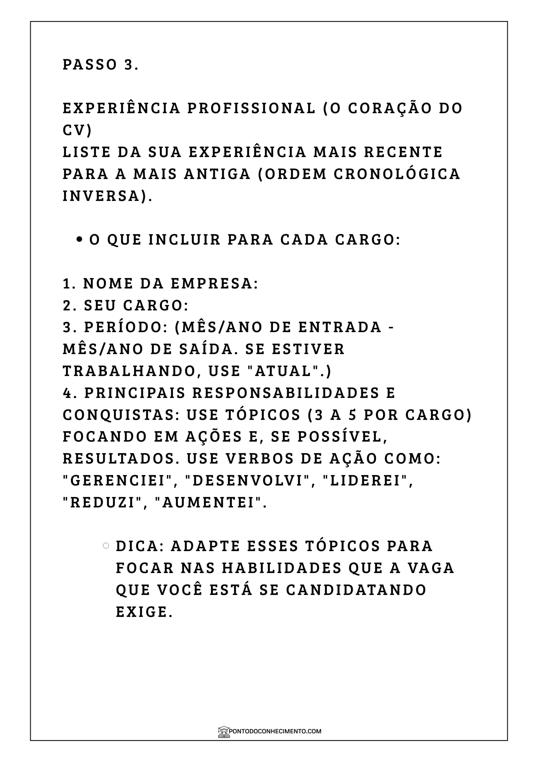 - Dica: Adapte esses tópicos para focar nas habilidades que a vaga que você está se candidatando exige.