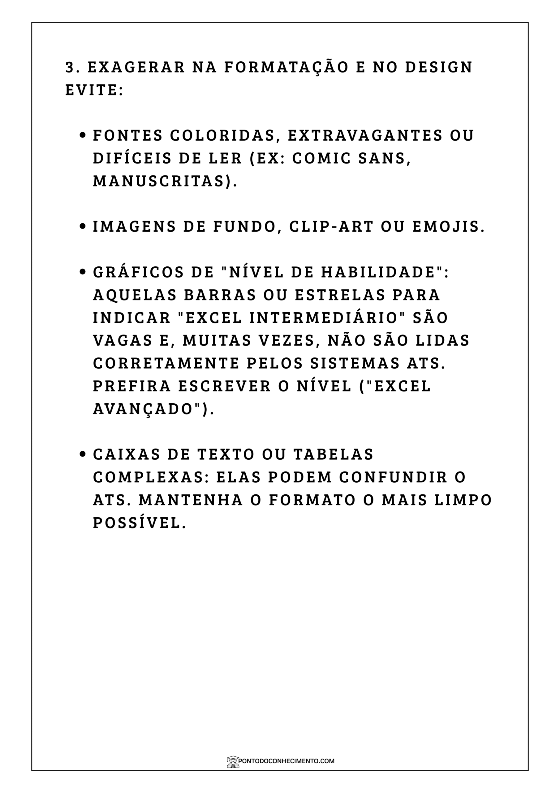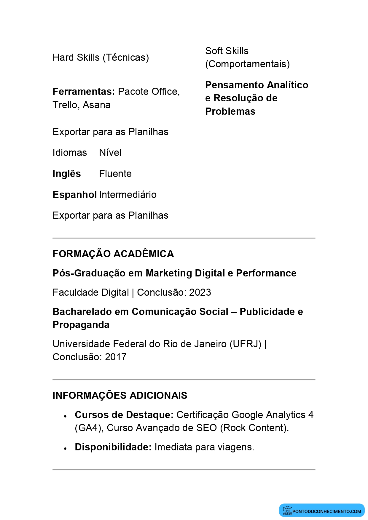 - Gráficos de “nível de habilidade”: Aquelas barras ou estrelas para indicar “Excel Intermediário” são vagas e, muitas vezes, não são lidas corretamente pelos sistemas ATS. Prefira escrever o nível (“Excel Avançado”).