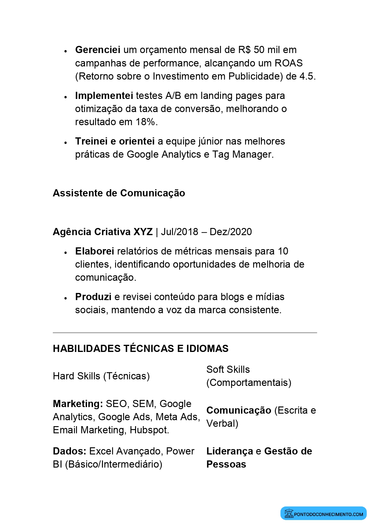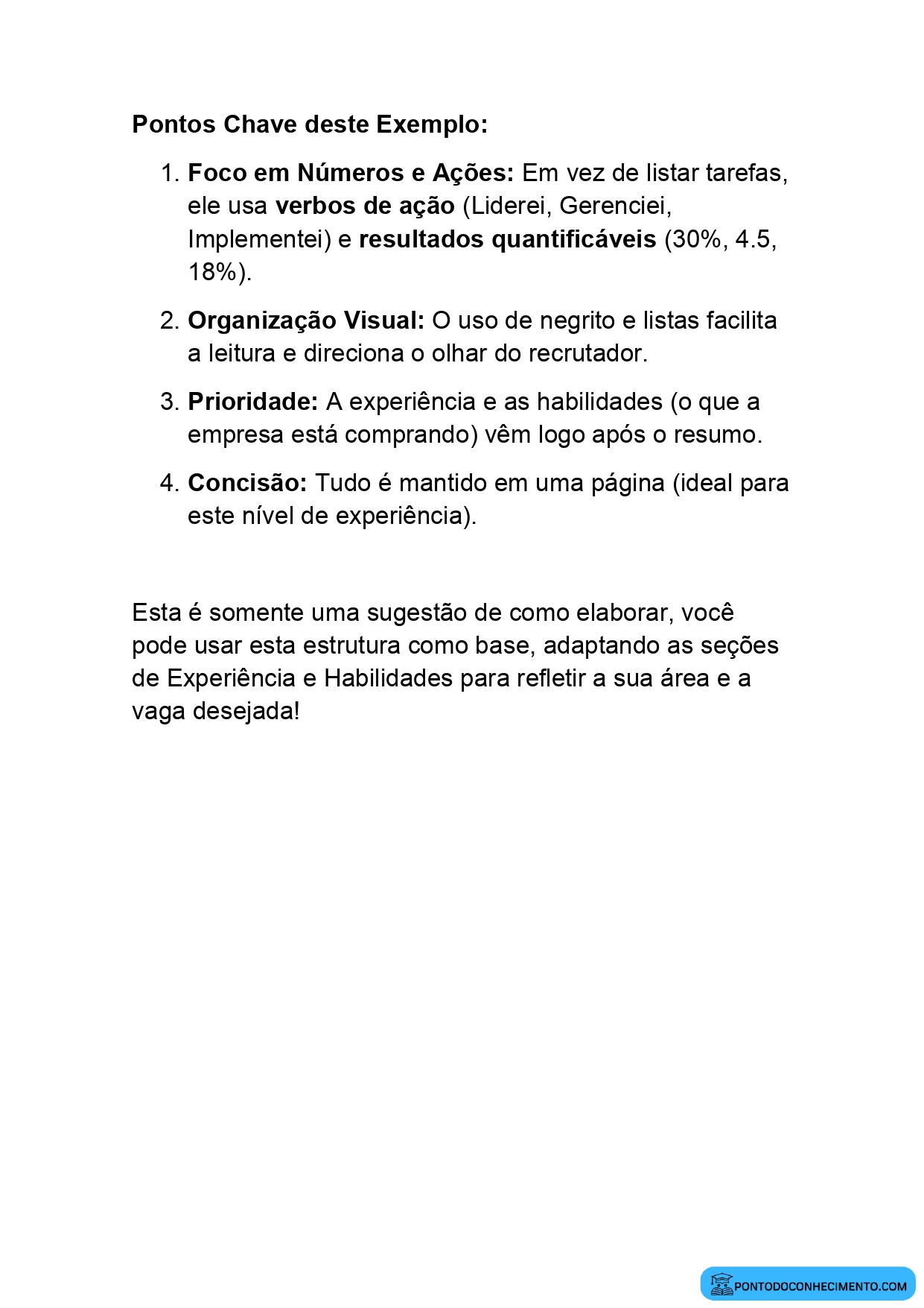 - Principais Responsabilidades e Conquistas: Use tópicos (3 a 5 por cargo) focando em ações e, se possível, resultados. Use verbos de ação como: “Gerenciei”, “Desenvolvi”, “Liderei”, “Reduzi”, “Aumentei”.