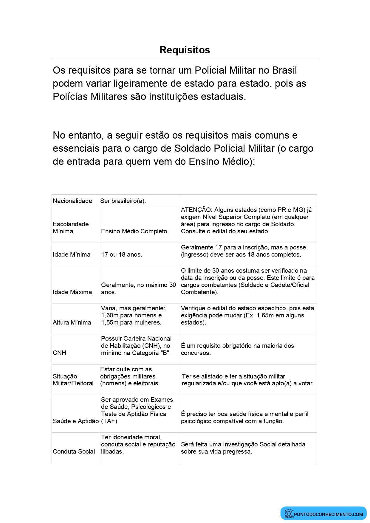 No entanto, a seguir estão os requisitos mais comuns e essenciais para o cargo de Soldado Policial Militar (o cargo de entrada para quem vem do Ensino Médio):
