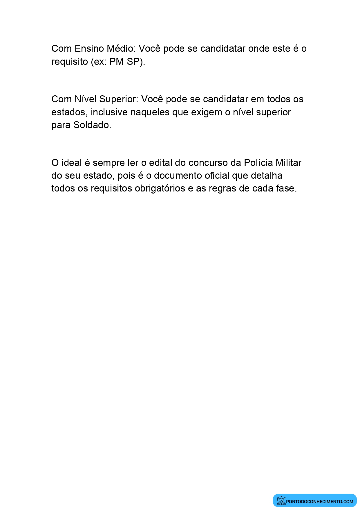 ATENÇÃO: Alguns estados (como PR e MG) já exigem Nível Superior Completo (em qualquer área) para ingresso no cargo de Soldado. Consulte o edital do seu estado.