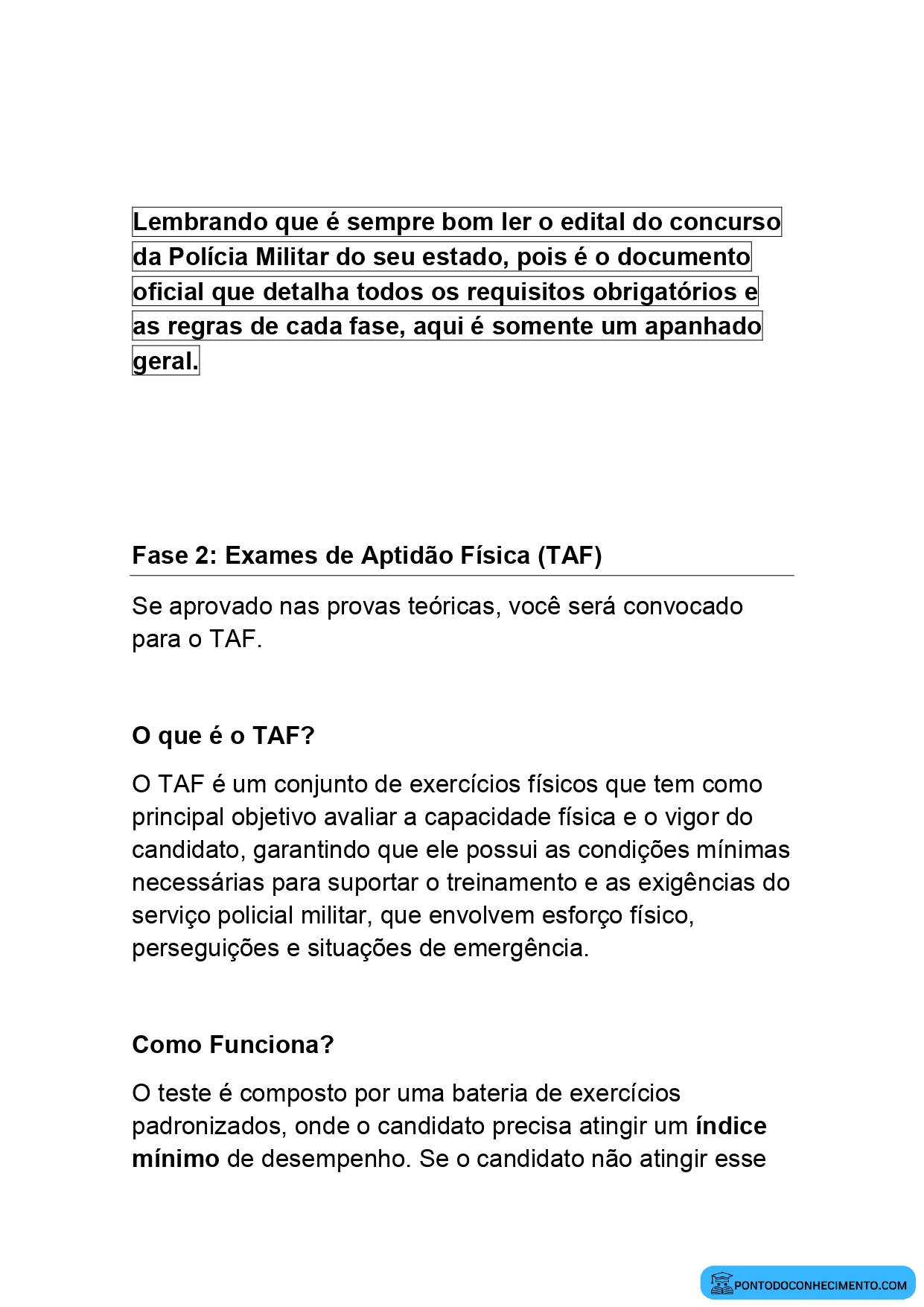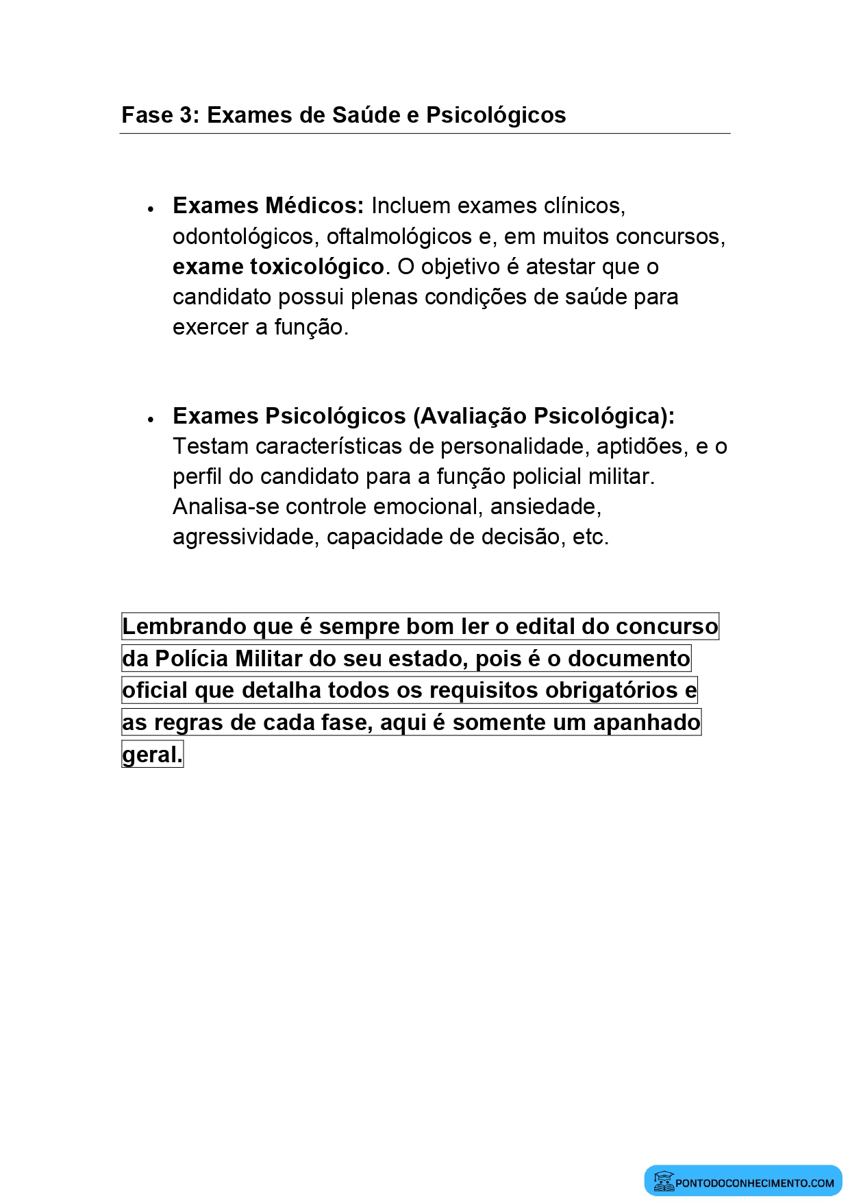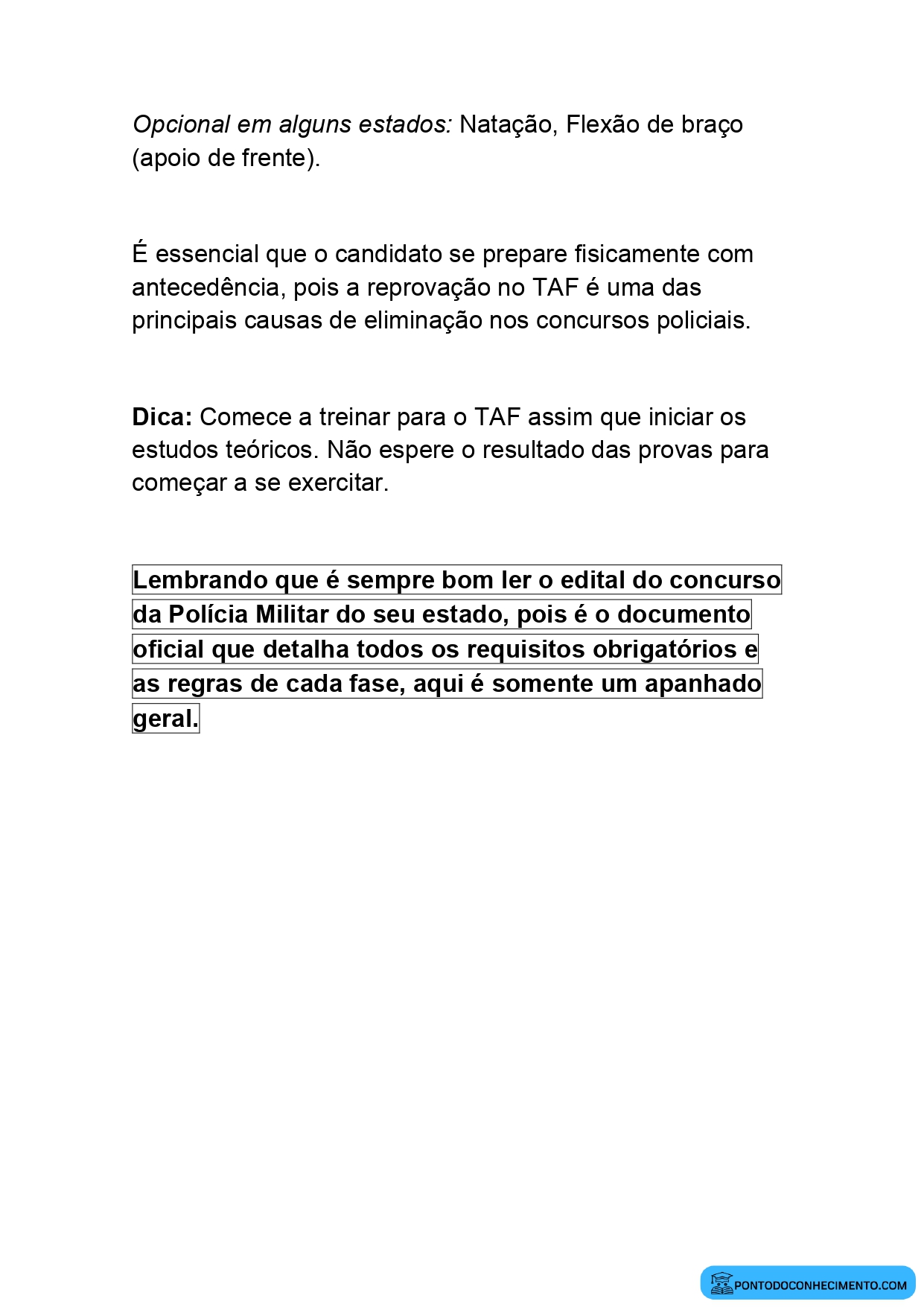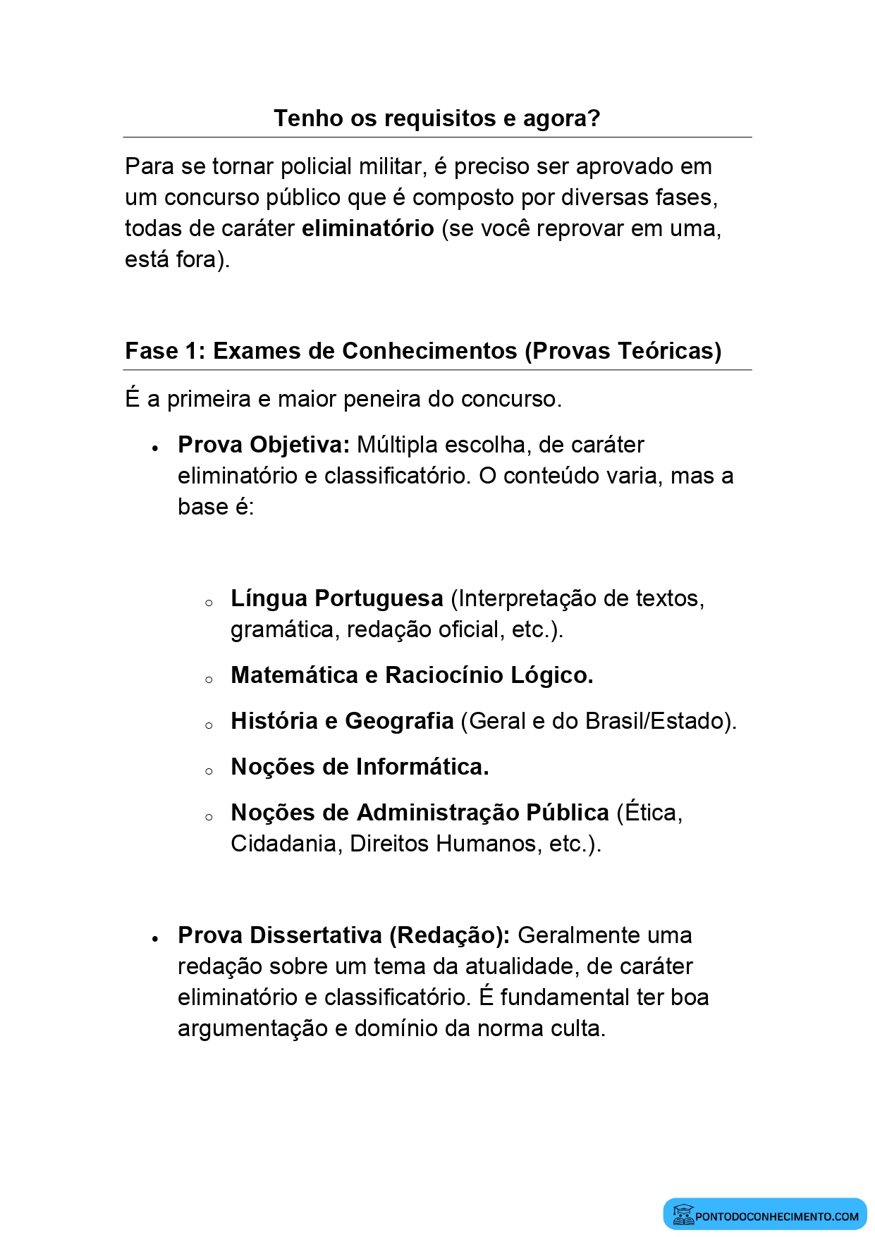 Lembrando que é sempre bom ler o edital do concurso da Polícia Militar do seu estado, pois é o documento oficial que detalha todos os requisitos obrigatórios e as regras de cada fase, aqui é somente um apanhado geral.