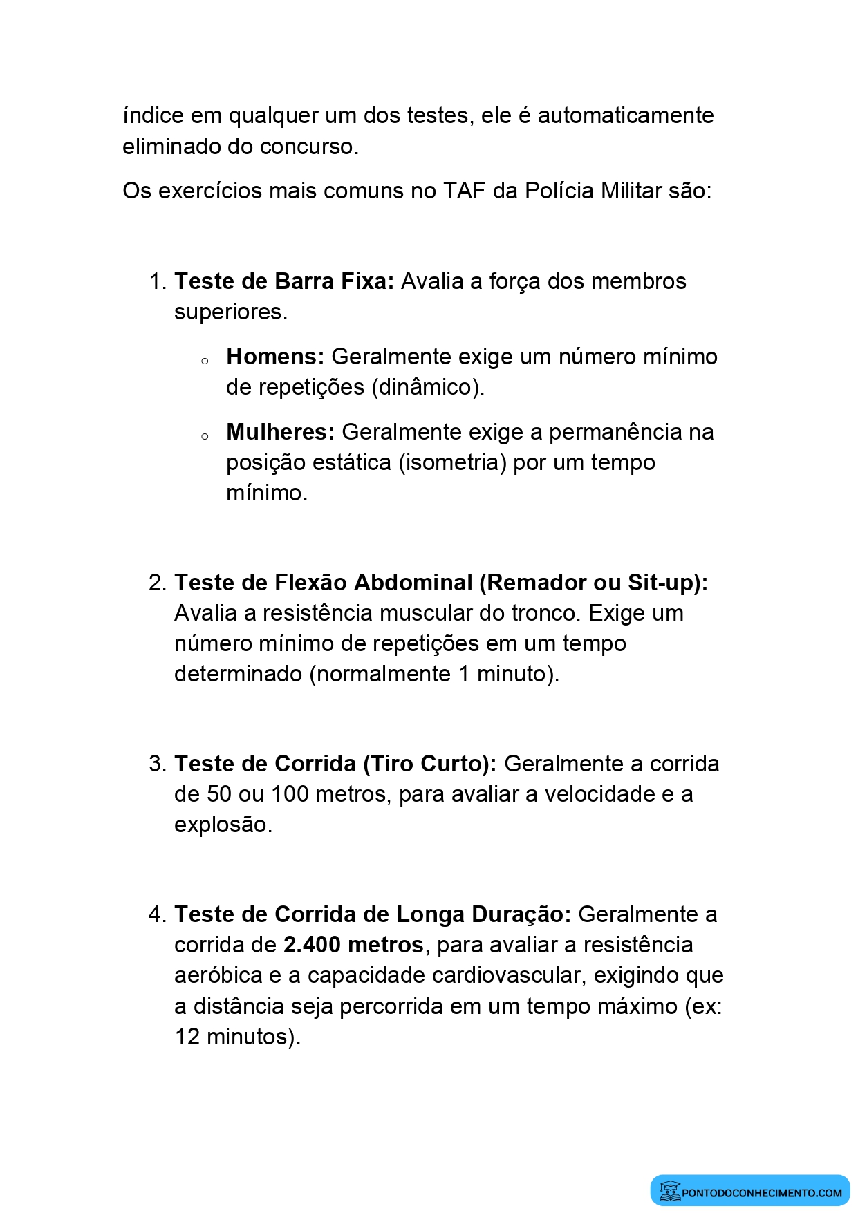 É essencial que o candidato se prepare fisicamente com antecedência, pois a reprovação no TAF é uma das principais causas de eliminação nos concursos policiais.