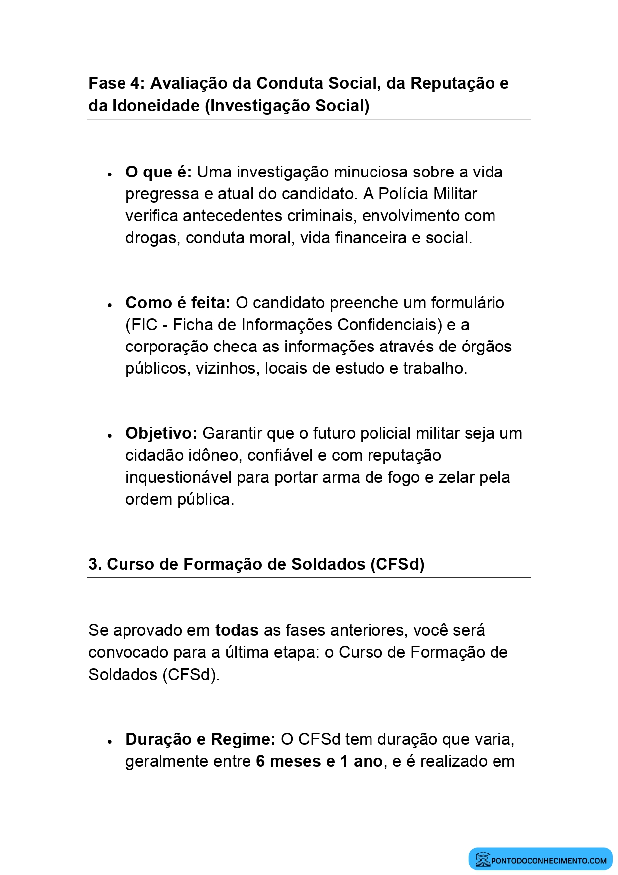 • O que é: Uma investigação minuciosa sobre a vida pregressa e atual do candidato. A Polícia Militar verifica antecedentes criminais, envolvimento com drogas, conduta moral, vida financeira e social.