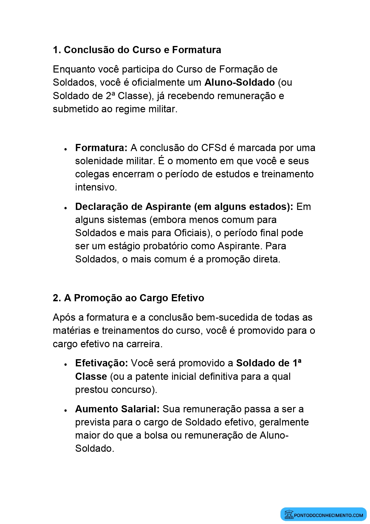 • Efetivação: Você será promovido a Soldado de 1ª Classe (ou a patente inicial definitiva para a qual prestou concurso).
