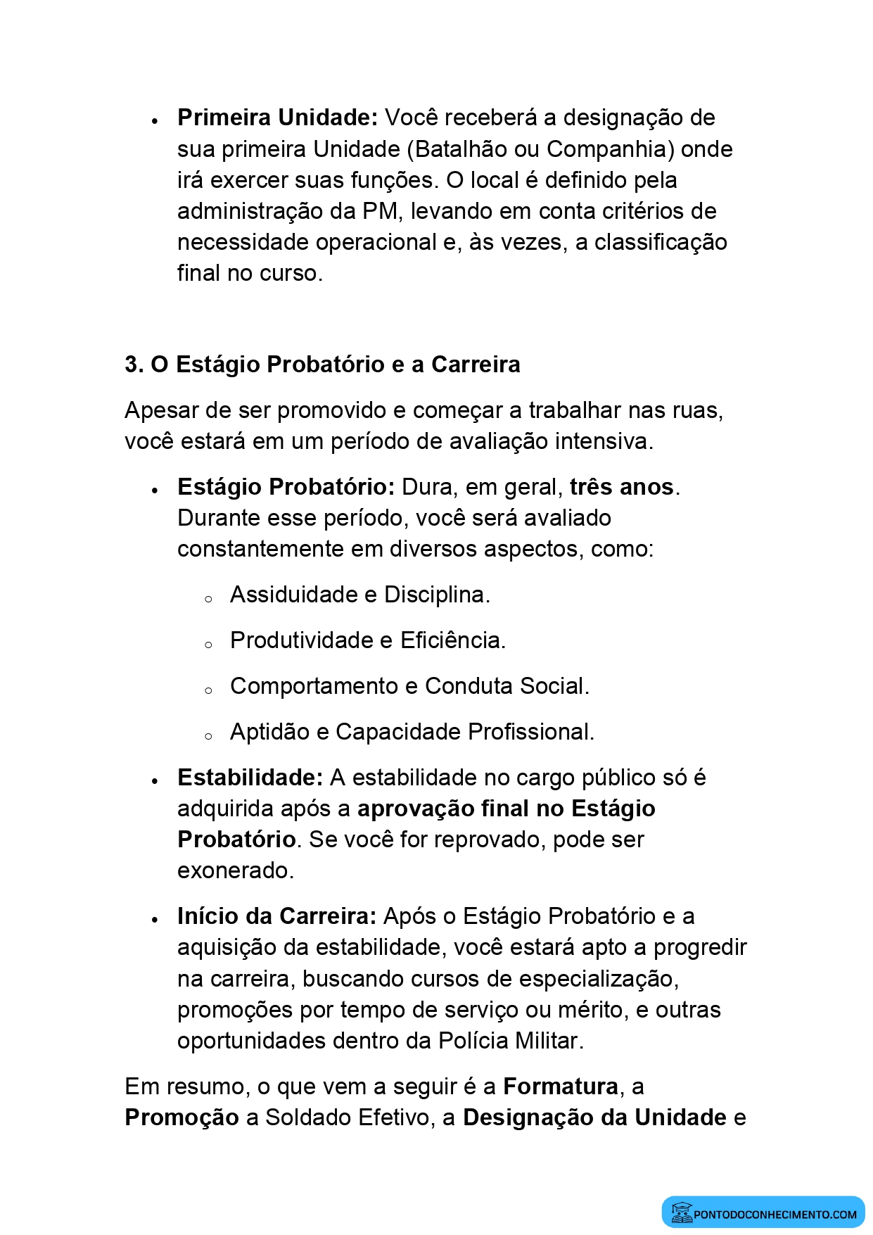 Em resumo, o que vem a seguir é a Formatura, a Promoção a Soldado Efetivo, a Designação da Unidade e o início do seu Estágio Probatório em serviço ativo nas ruas.