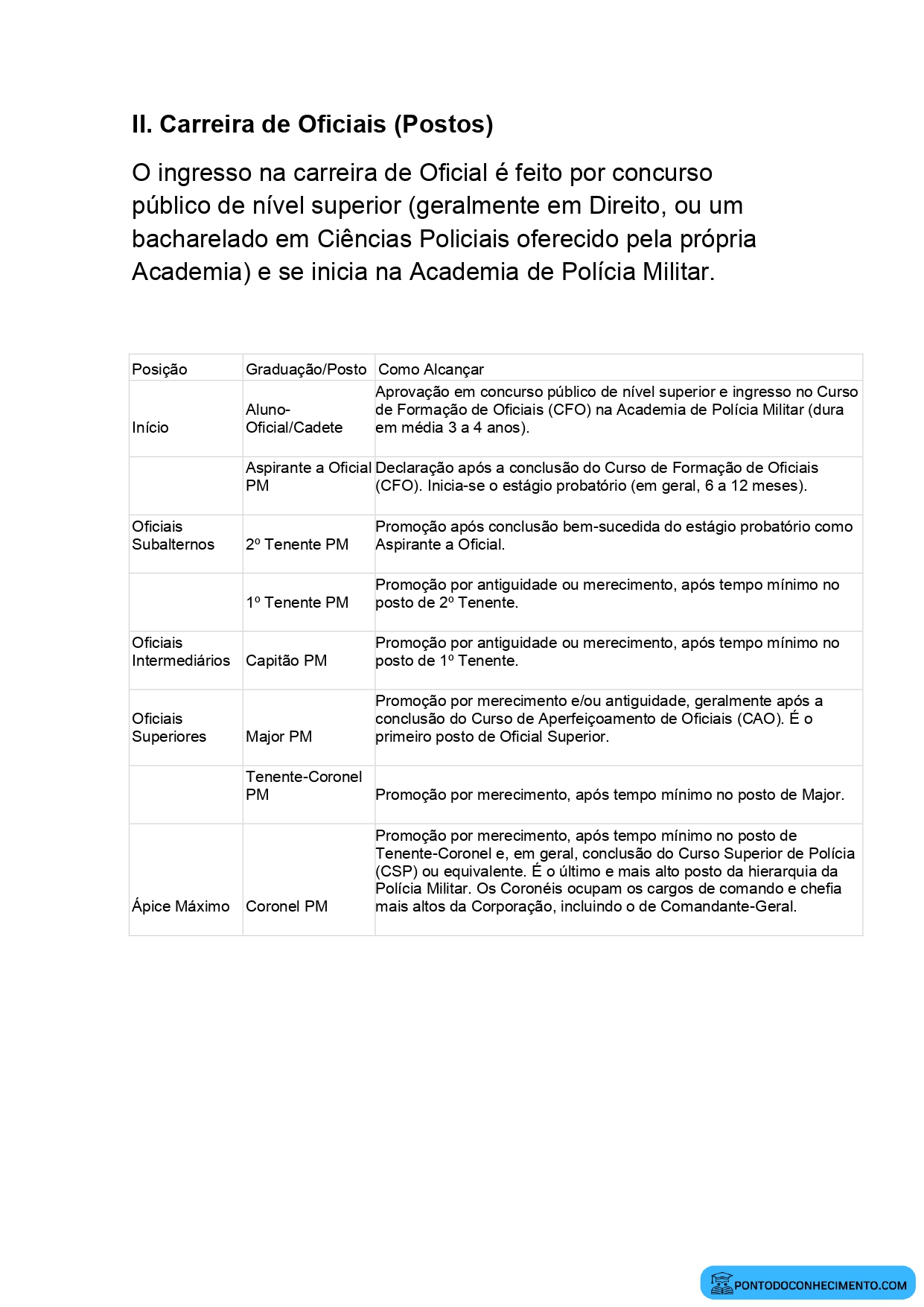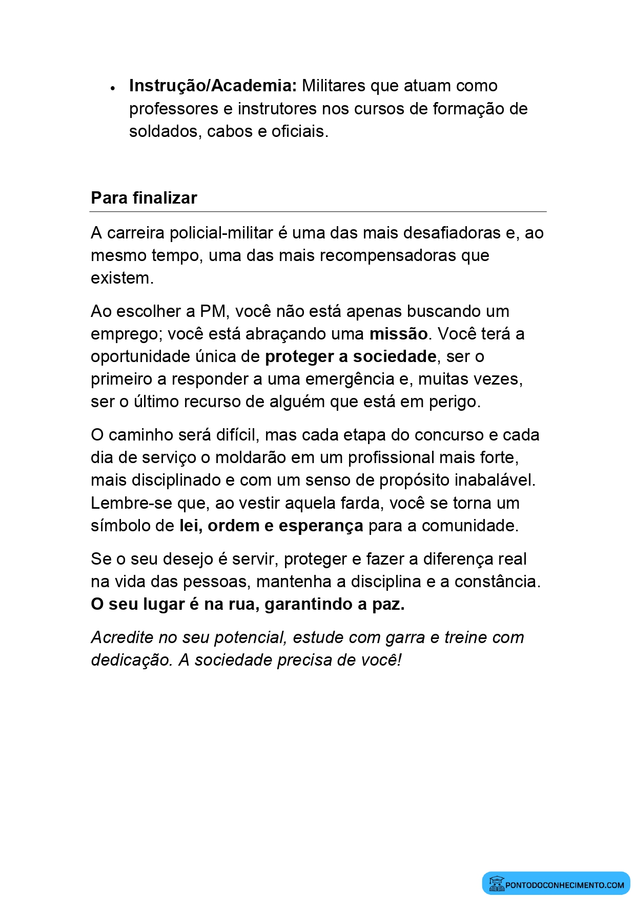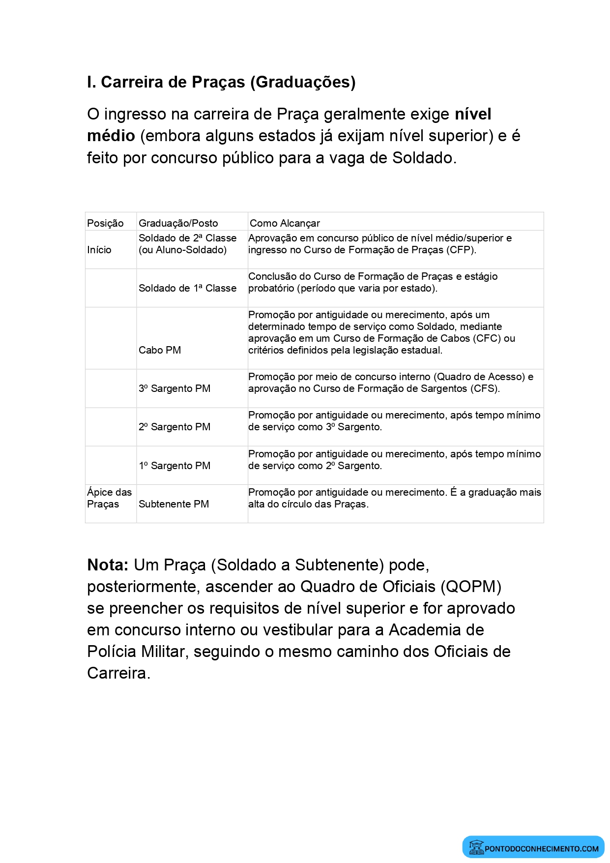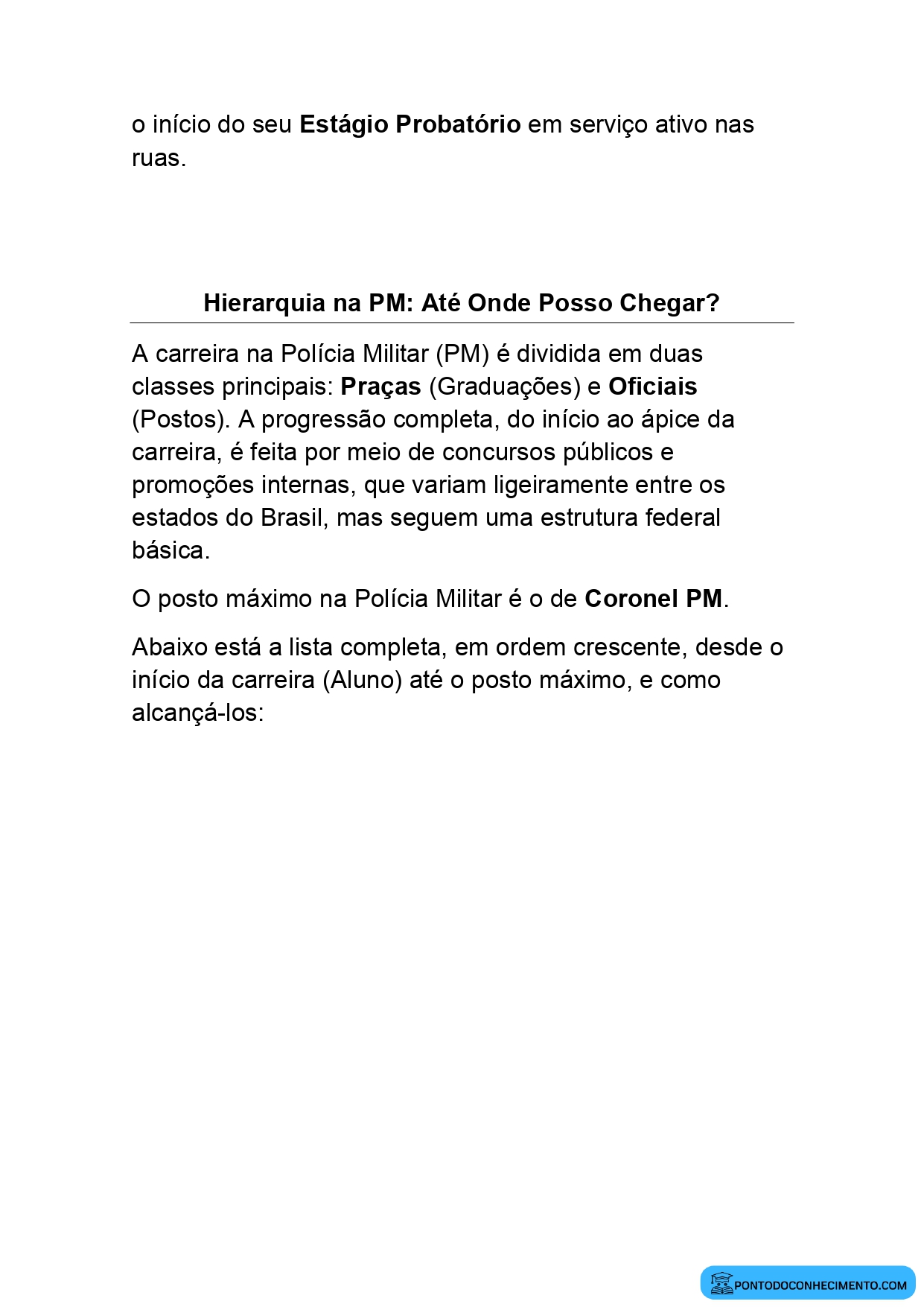 • Início da Carreira: Após o Estágio Probatório e a aquisição da estabilidade, você estará apto a progredir na carreira, buscando cursos de especialização, promoções por tempo de serviço ou mérito, e outras oportunidades dentro da Polícia Militar.