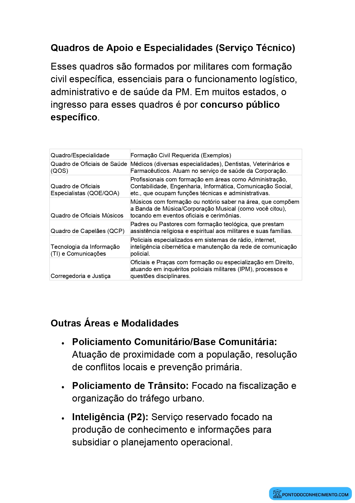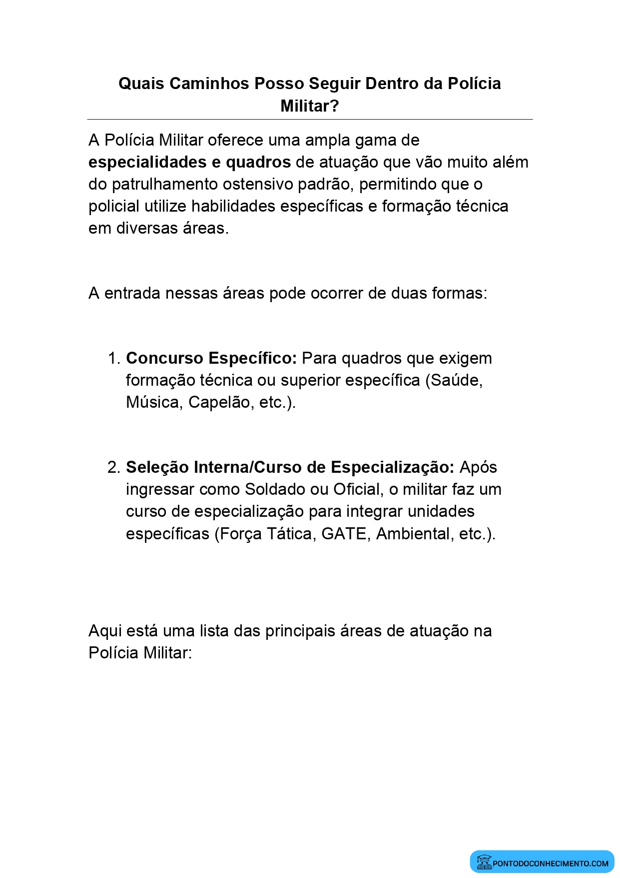 A Polícia Militar oferece uma ampla gama de especialidades e quadros de atuação que vão muito além do patrulhamento ostensivo padrão, permitindo que o policial utilize habilidades específicas e formação técnica em diversas áreas.