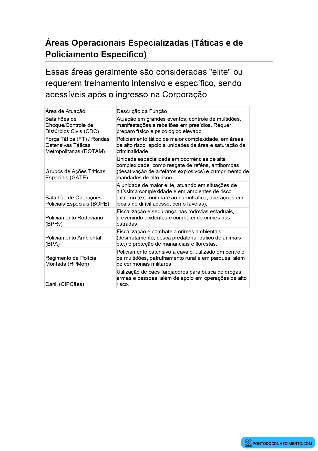 Aqui está uma lista das principais áreas de atuação na Polícia Militar: