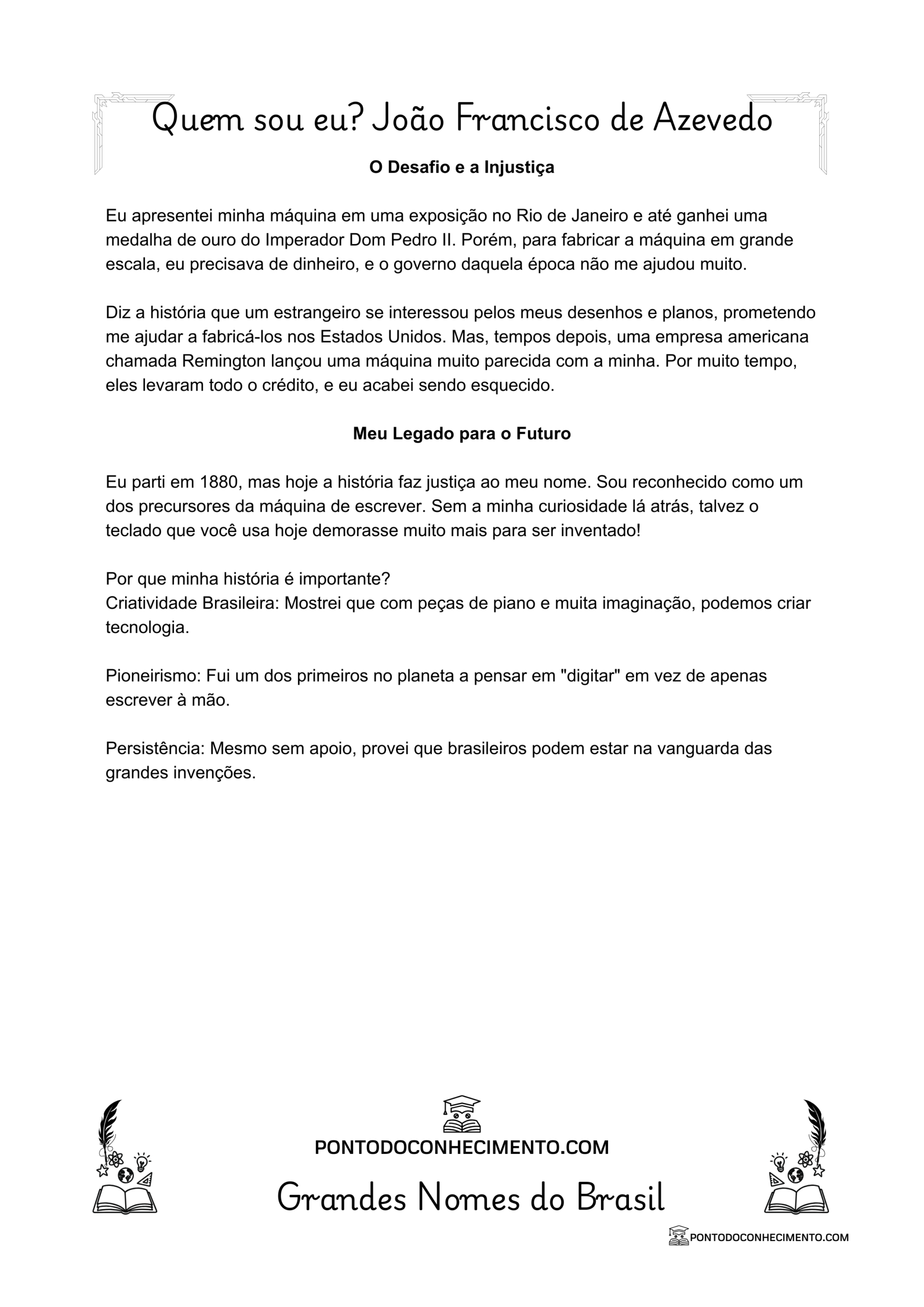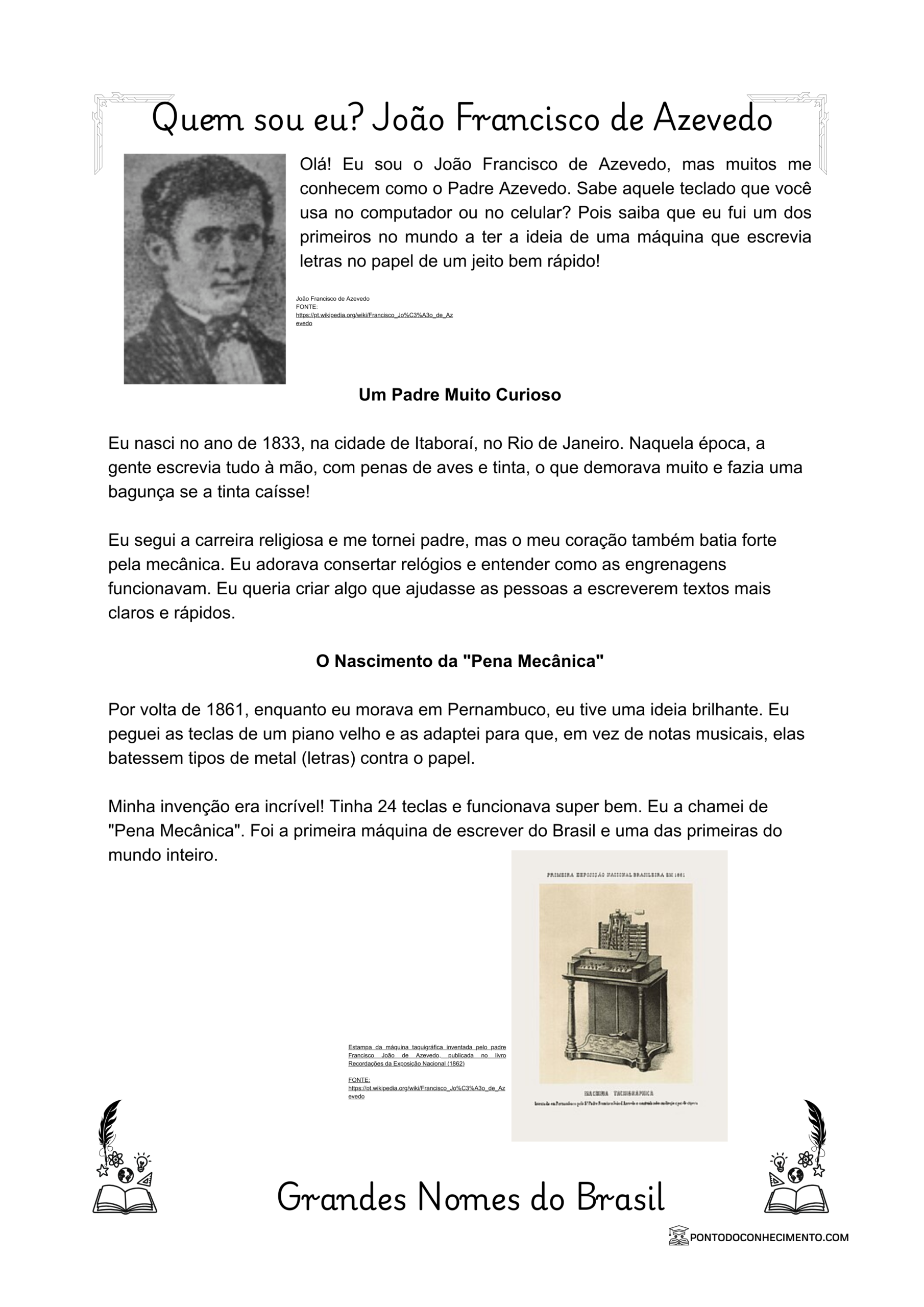 Olá! Eu sou o João Francisco de Azevedo, mas muitos me conhecem como o Padre Azevedo. Sabe aquele teclado que você usa no computador ou no celular? Pois saiba que eu fui um dos primeiros no mundo a ter a ideia de uma máquina que escrevia letras no papel de um jeito bem rápido!