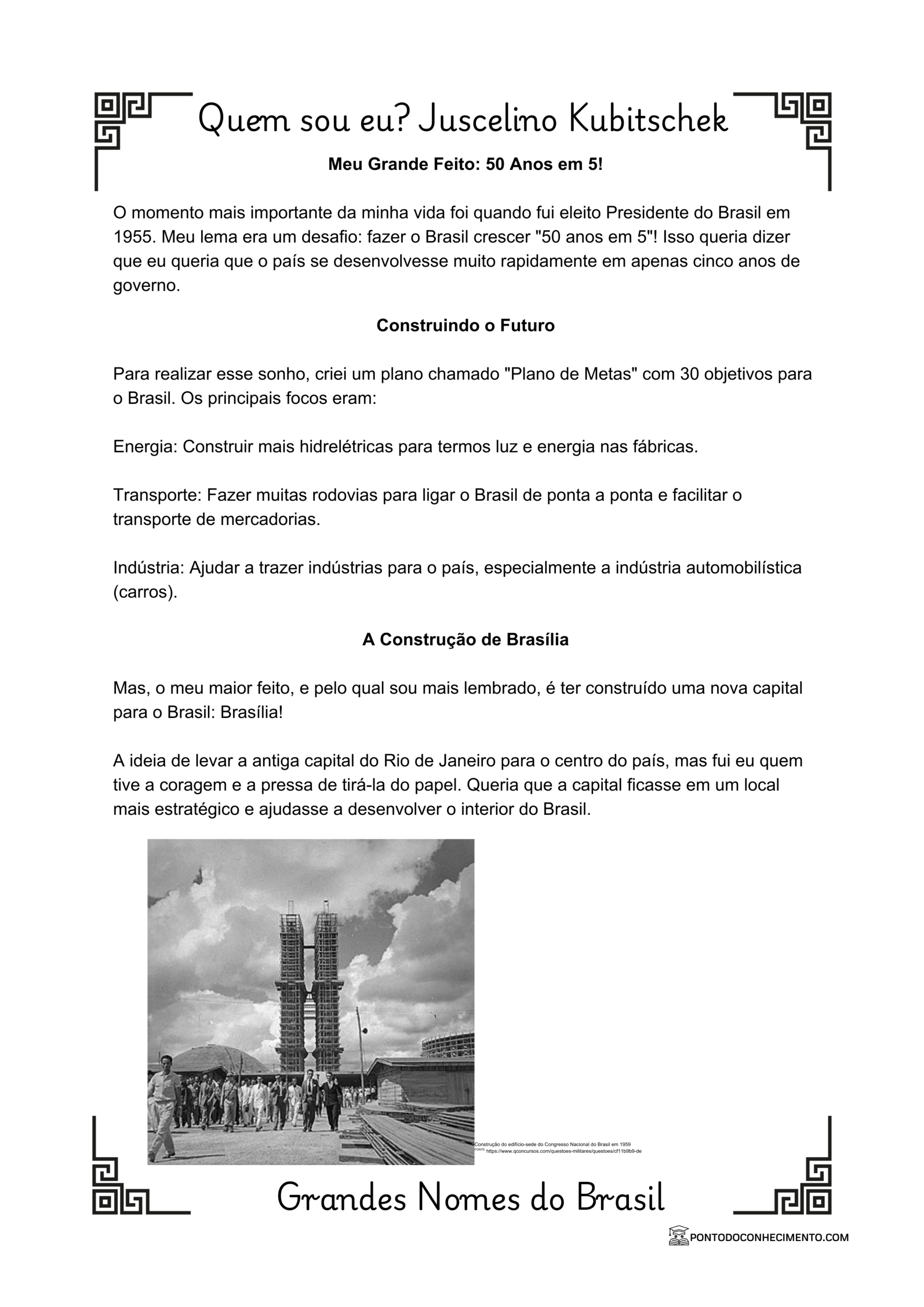 O momento mais importante da minha vida foi quando fui eleito Presidente do Brasil em 1955. Meu lema era um desafio: fazer o Brasil crescer “50 anos em 5”! Isso queria dizer que eu queria que o país se desenvolvesse muito rapidamente em apenas cinco anos de governo.