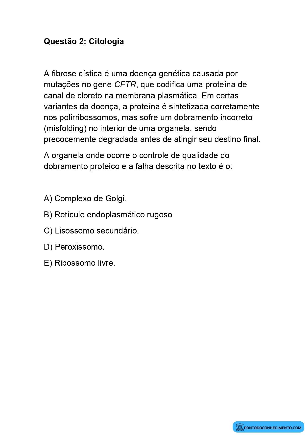 A fibrose cística é uma doença genética causada por mutações no gene CFTR, que codifica uma proteína de canal de cloreto na membrana plasmática. Em certas variantes da doença, a proteína é sintetizada corretamente nos polirribossomos, mas sofre um dobramento incorreto (misfolding) no interior de uma organela, sendo precocemente degradada antes de atingir seu destino final.