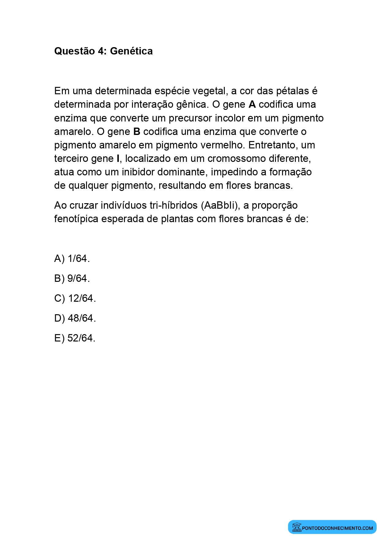 Em uma determinada espécie vegetal, a cor das pétalas é determinada por interação gênica. O gene A codifica uma enzima que converte um precursor incolor em um pigmento amarelo. O gene B codifica uma enzima que converte o pigmento amarelo em pigmento vermelho. Entretanto, um terceiro gene I, localizado em um cromossomo diferente, atua como um inibidor dominante, impedindo a formação de qualquer pigmento, resultando em flores brancas.