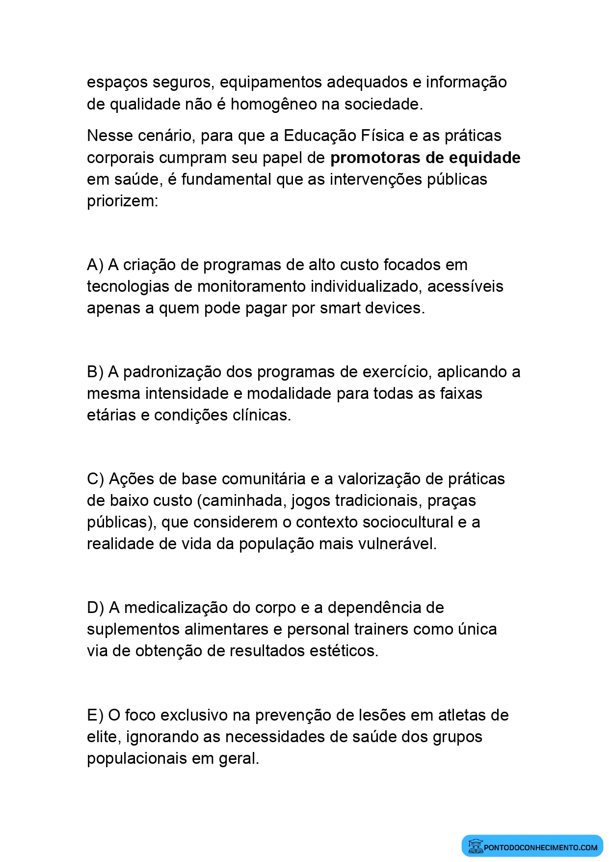 - C) Ações de base comunitária e a valorização de práticas de baixo custo (caminhada, jogos tradicionais, praças públicas), que considerem o contexto sociocultural e a realidade de vida da população mais vulnerável.