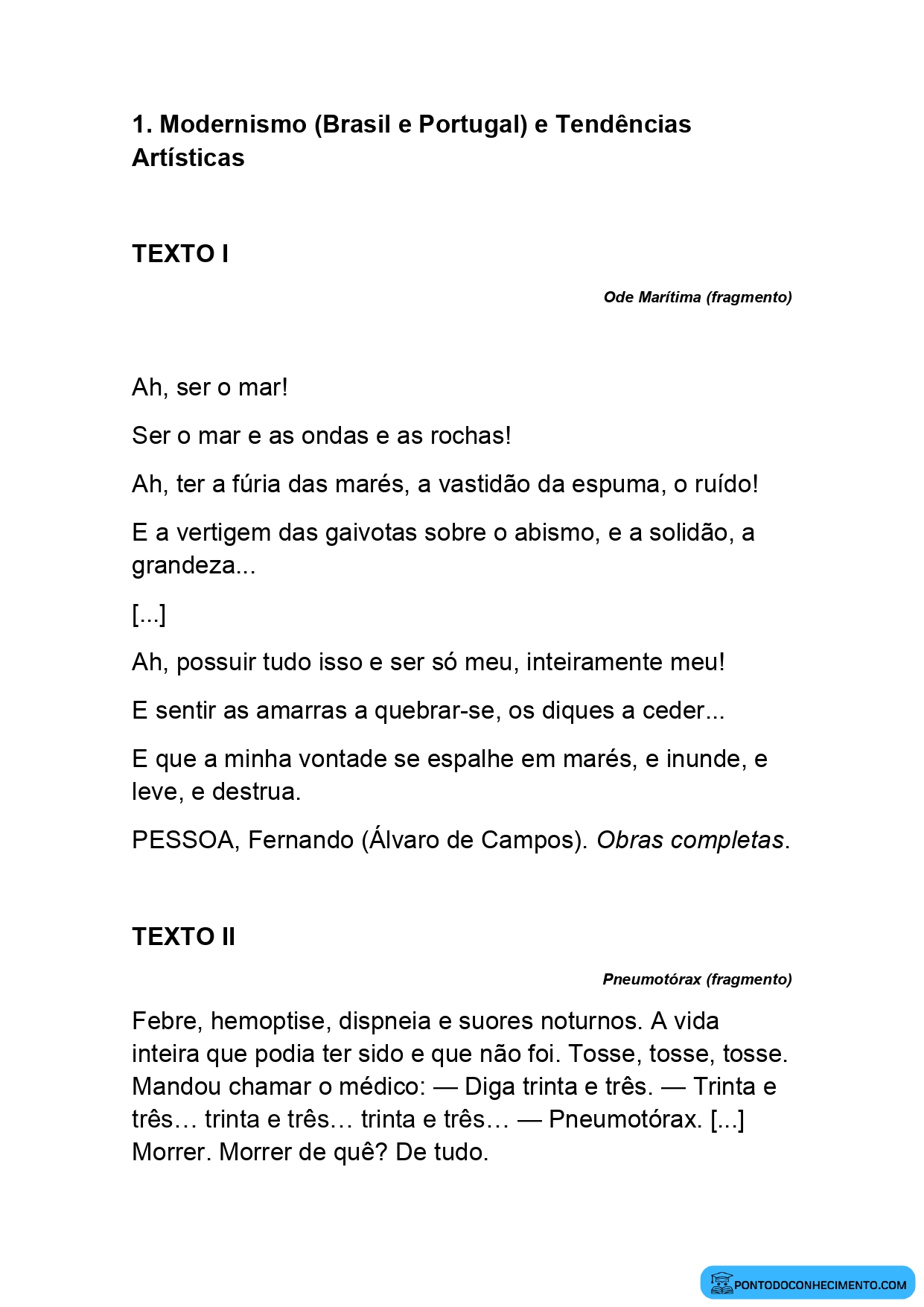 1. C) A Ode Marítima recuperar o subjetivismo ultrarromântico ao idealizar o mar como refúgio, ao passo que Pneumotórax assume uma perspectiva satírica e de crítica social tipicamente da primeira fase modernista brasileira.