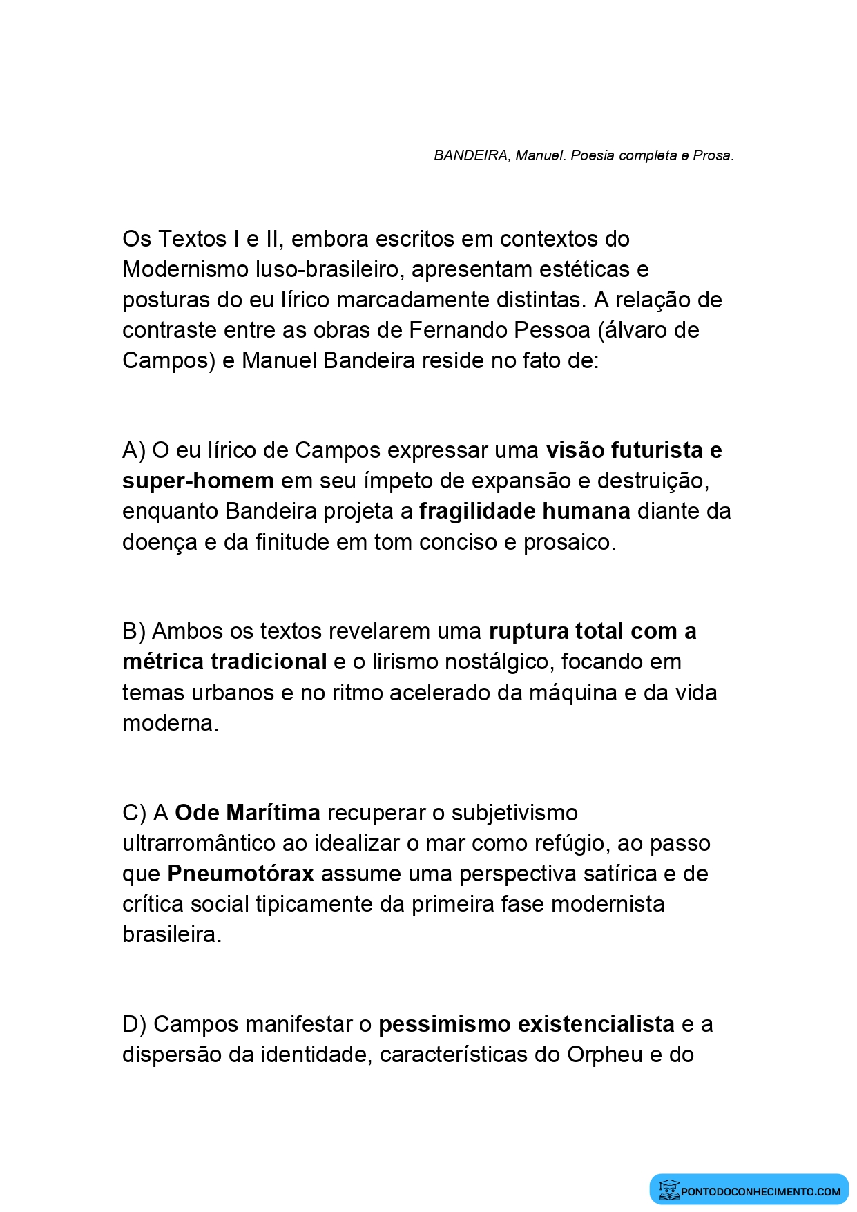 1. A) O eu lírico de Campos expressar uma visão futurista e super-homem em seu ímpeto de expansão e destruição, enquanto Bandeira projeta a fragilidade humana diante da doença e da finitude em tom conciso e prosaico.