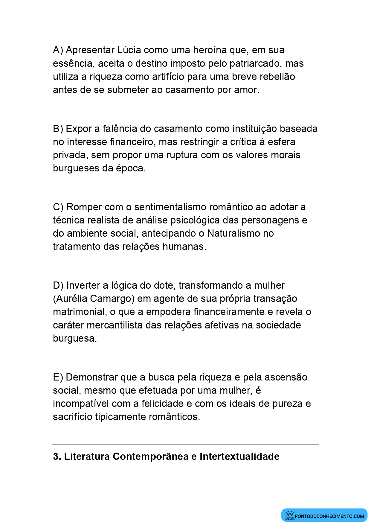 1. D) Inverter a lógica do dote, transformando a mulher (Aurélia Camargo) em agente de sua própria transação matrimonial, o que a empodera financeiramente e revela o caráter mercantilista das relações afetivas na sociedade burguesa.