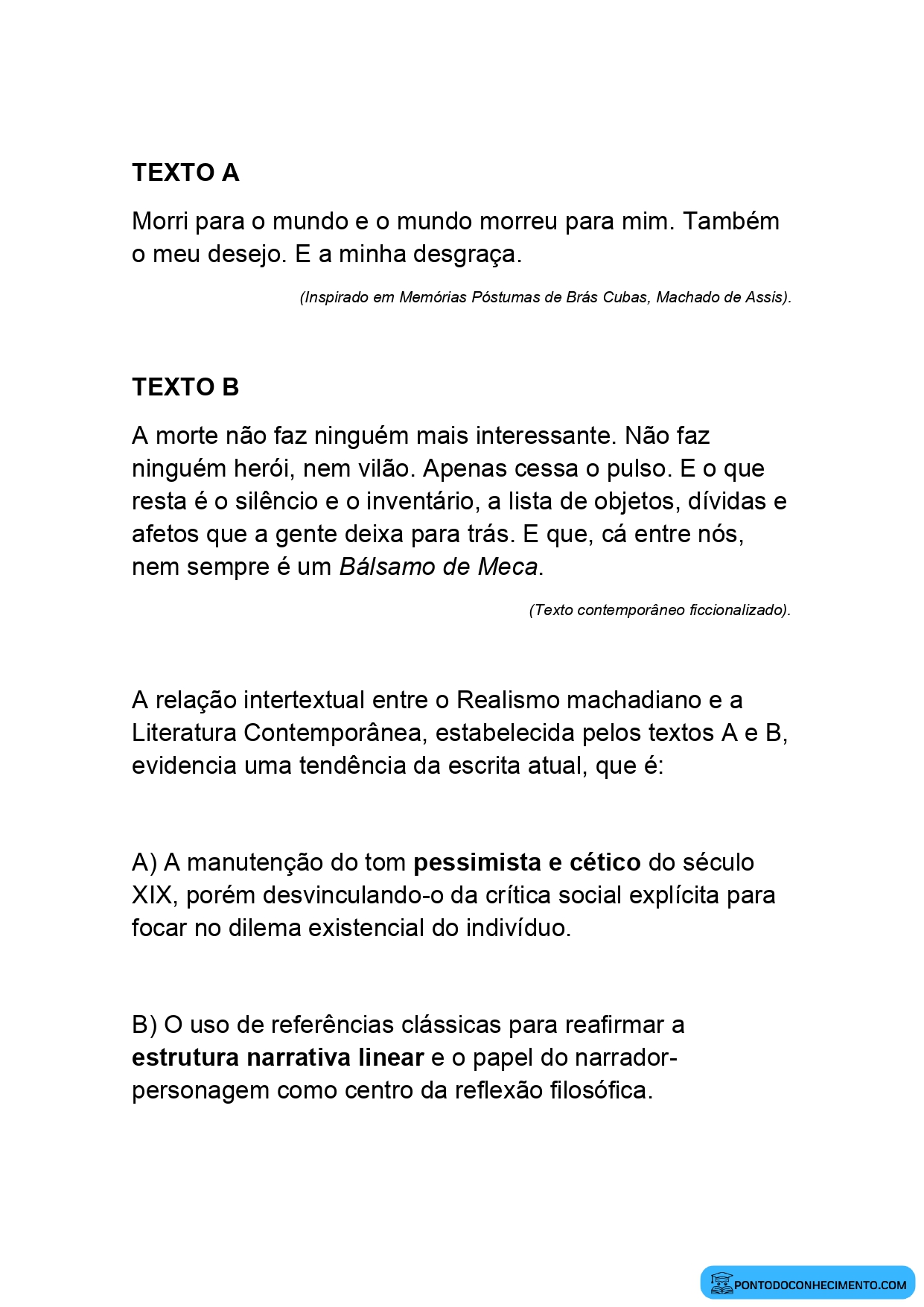 1. A) A manutenção do tom pessimista e cético do século XIX, porém desvinculando-o da crítica social explícita para focar no dilema existencial do indivíduo.