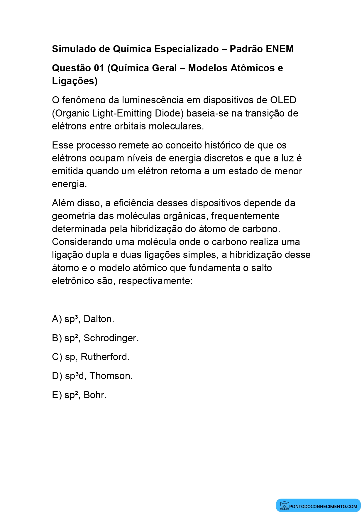 Questão 01 (Química Geral – Modelos Atômicos e Ligações)