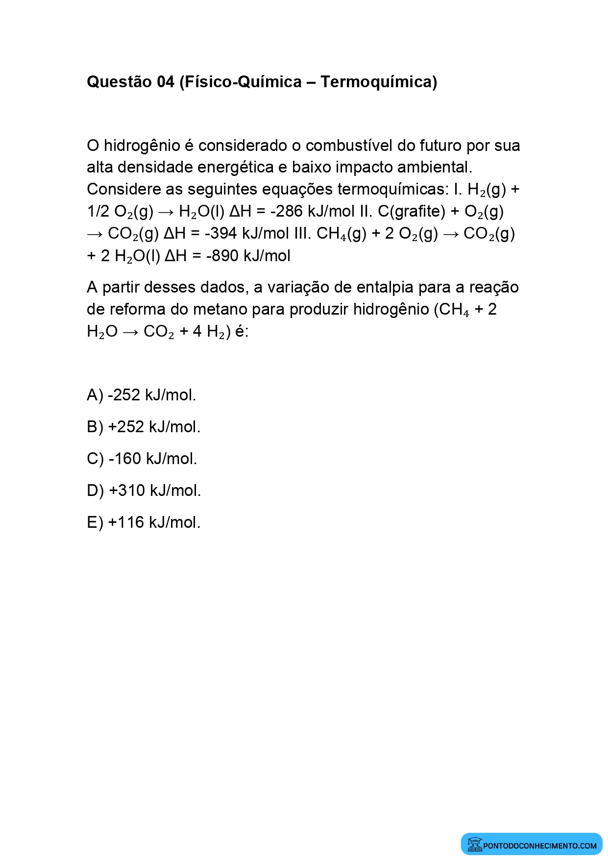 A partir desses dados, a variação de entalpia para a reação de reforma do metano para produzir hidrogênio (CH₄ + 2 H₂O → CO₂ + 4 H₂) é: