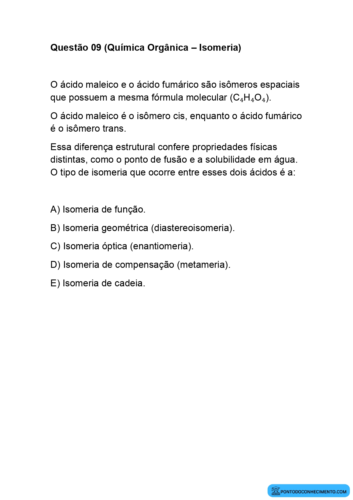 Essa diferença estrutural confere propriedades físicas distintas, como o ponto de fusão e a solubilidade em água. O tipo de isomeria que ocorre entre esses dois ácidos é a: