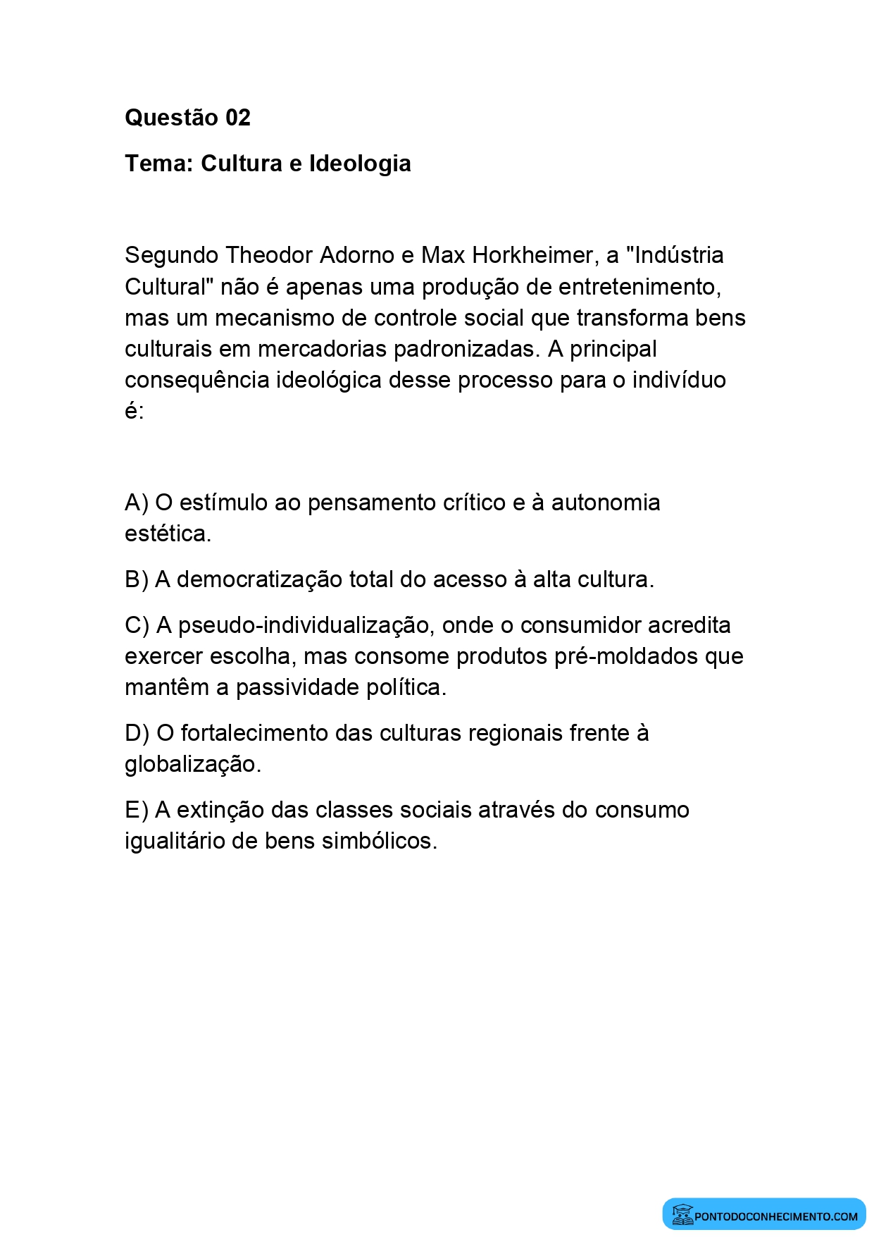 Segundo Theodor Adorno e Max Horkheimer, a “Indústria Cultural” não é apenas uma produção de entretenimento, mas um mecanismo de controle social que transforma bens culturais em mercadorias padronizadas. A principal consequência ideológica desse processo para o indivíduo é: