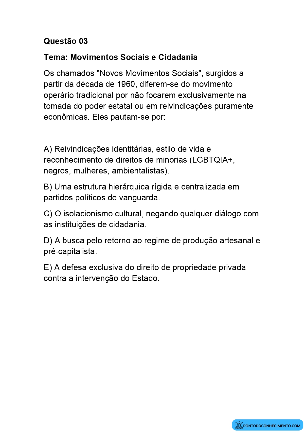 - A) Reivindicações identitárias, estilo de vida e reconhecimento de direitos de minorias (LGBTQIA+, negros, mulheres, ambientalistas).