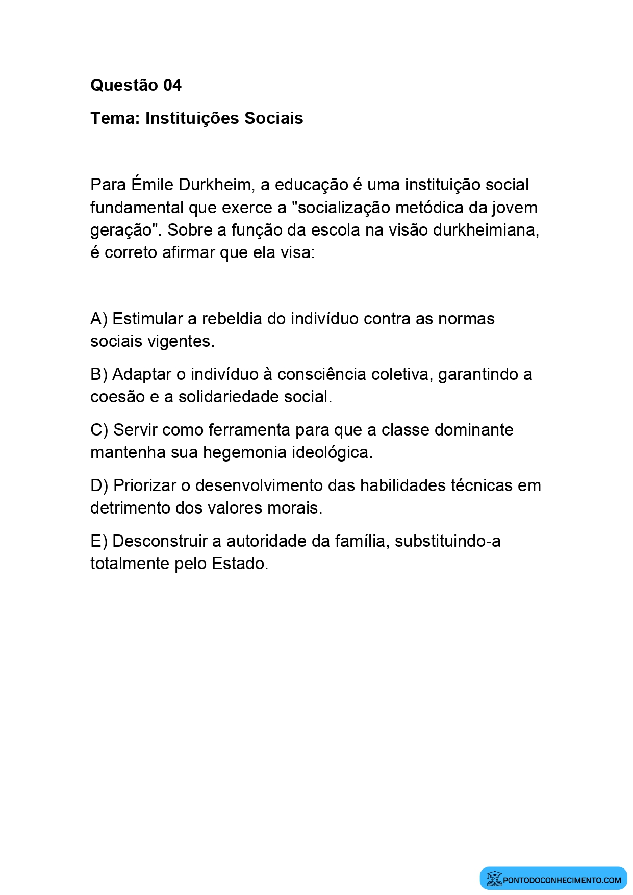 Para Émile Durkheim, a educação é uma instituição social fundamental que exerce a “socialização metódica da jovem geração”. Sobre a função da escola na visão durkheimiana, é correto afirmar que ela visa: