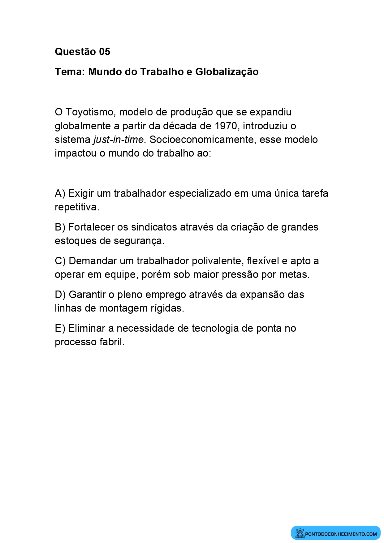 O Toyotismo, modelo de produção que se expandiu globalmente a partir da década de 1970, introduziu o sistema just-in-time. Socioeconomicamente, esse modelo impactou o mundo do trabalho ao: