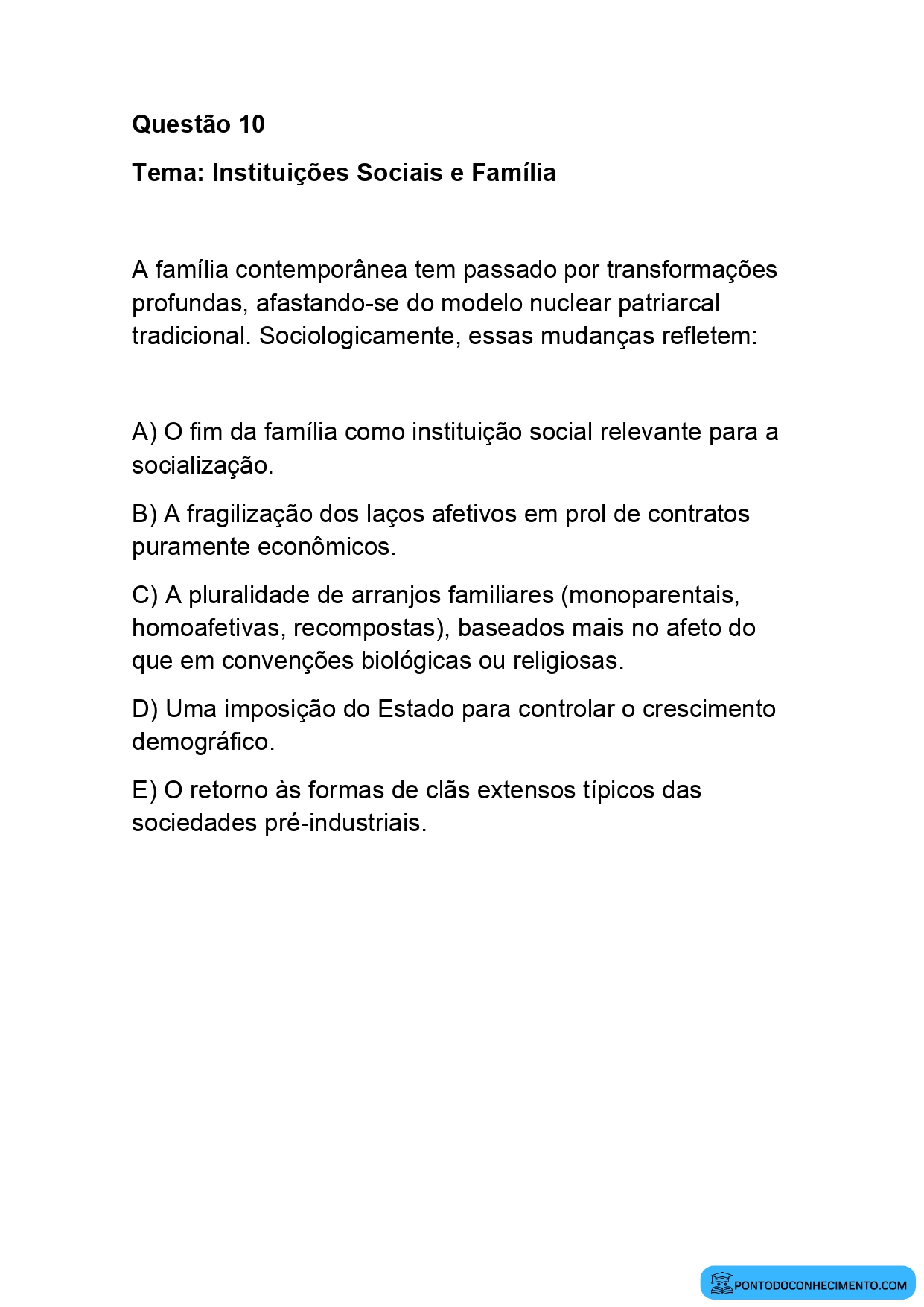A família contemporânea tem passado por transformações profundas, afastando-se do modelo nuclear patriarcal tradicional. Sociologicamente, essas mudanças refletem: