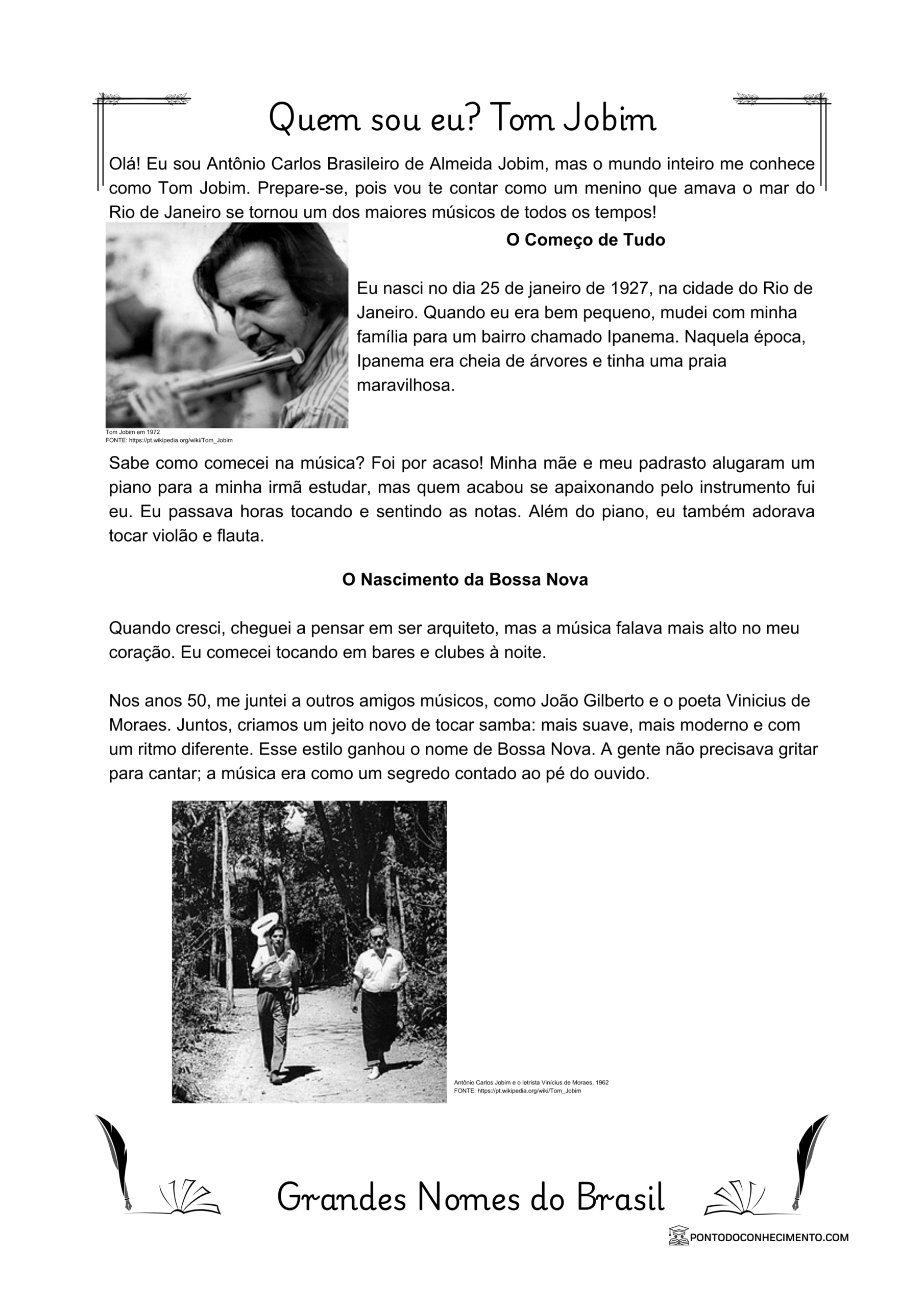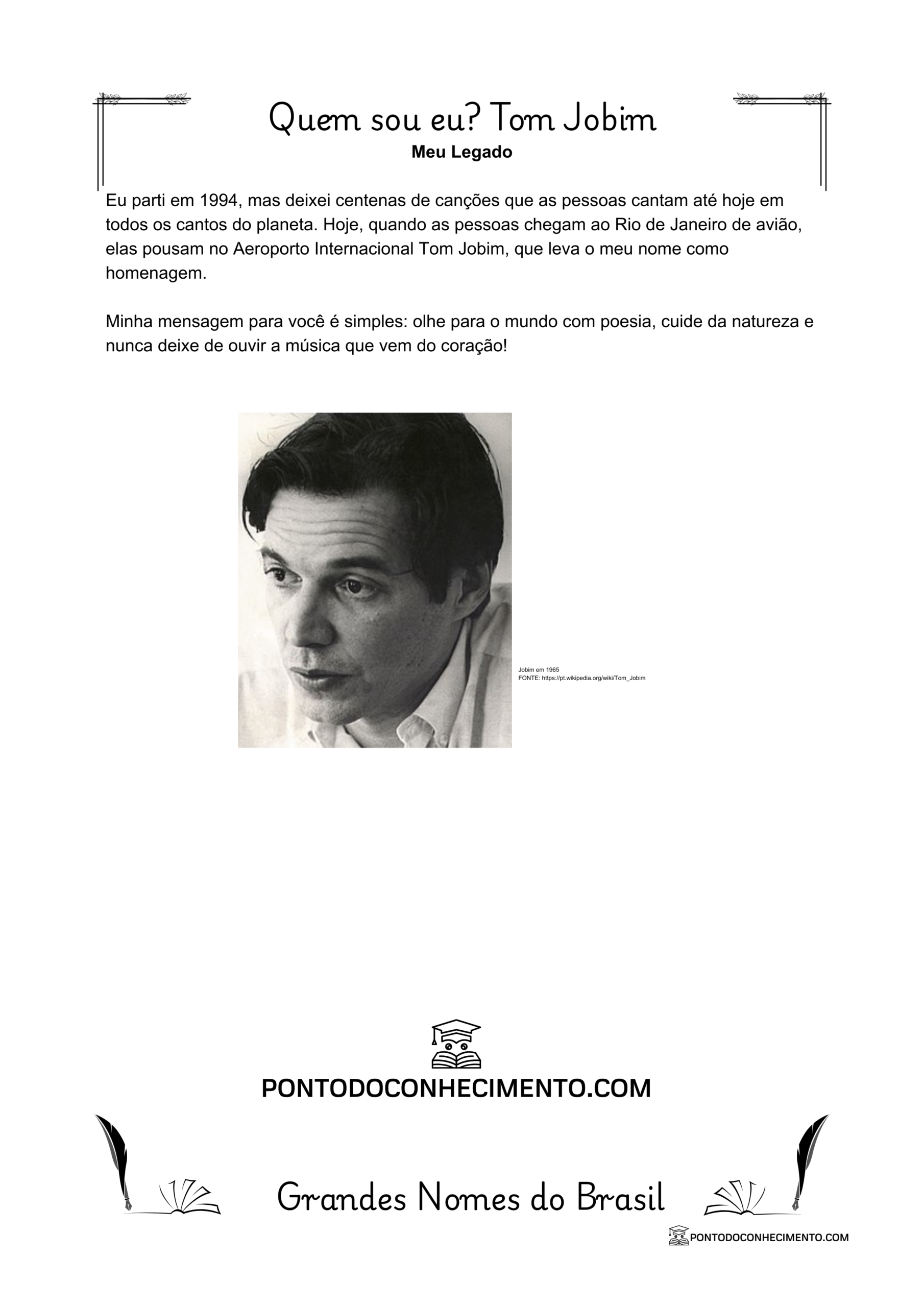Garota de Ipanema: Junto com Vinicius de Moraes, escrevi essa música que se tornou uma das mais famosas do mundo inteiro! Ela foi inspirada em uma moça linda que passava a caminho do mar.